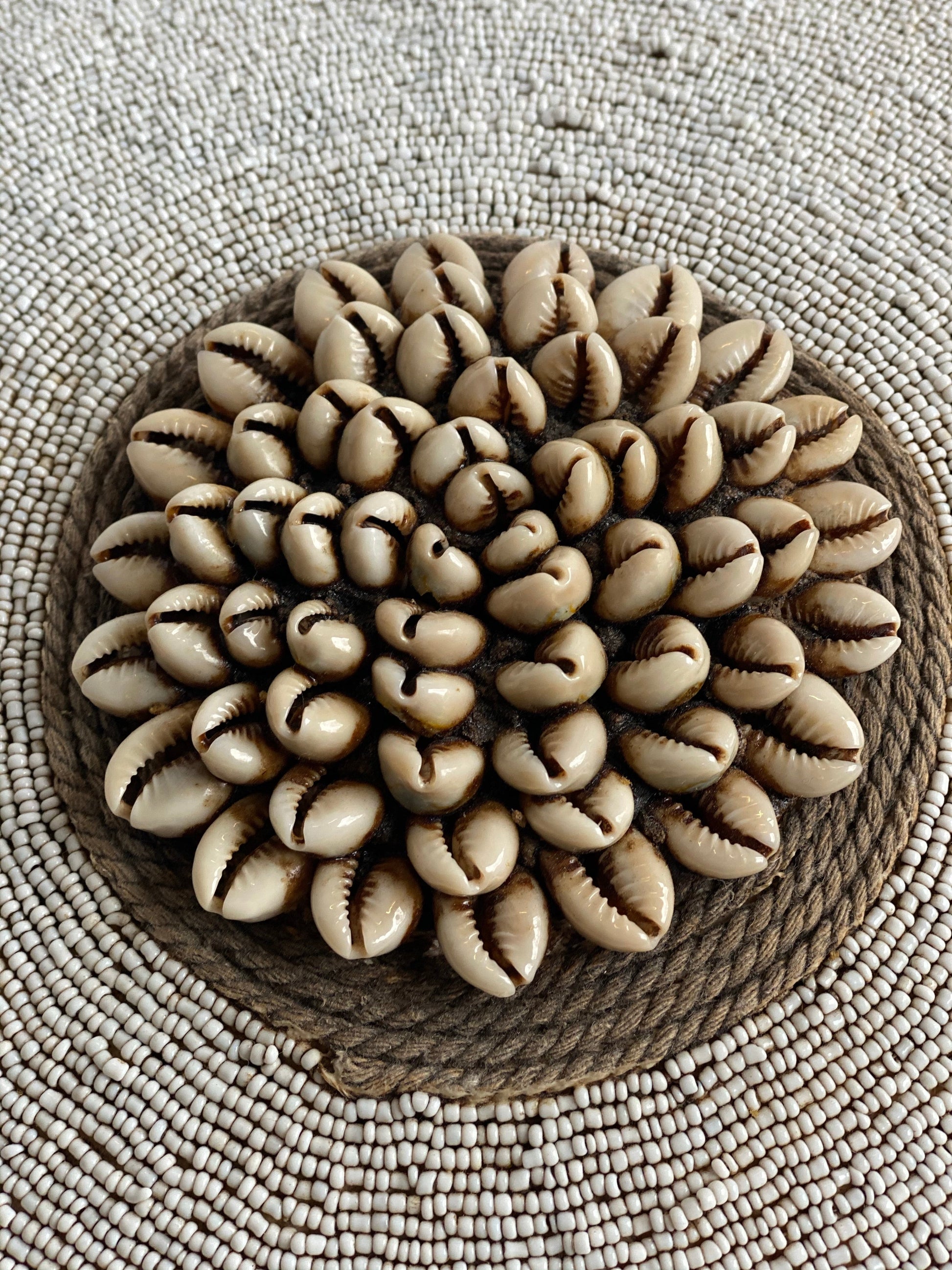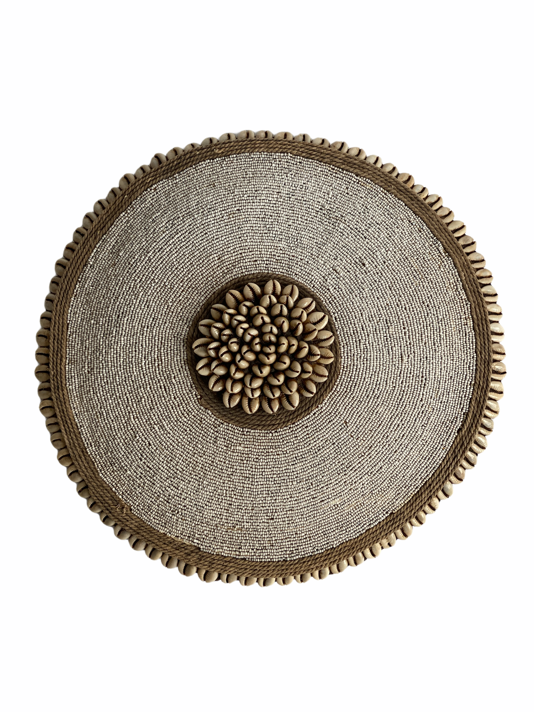This design is surrounded in Cowrie shells and thousands of black and white tiny beads with a central cluster of Cowrie beads.