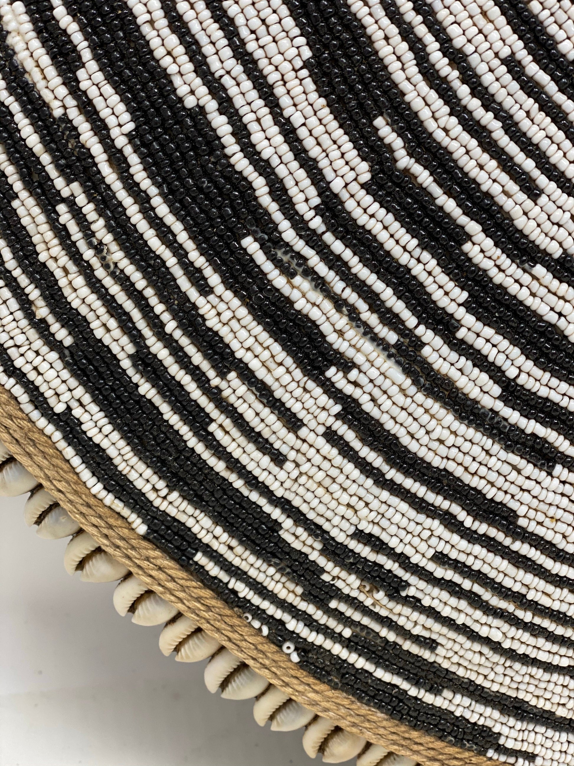 Features thousands of small pearly white beads with a central cluster of Cowrie Shells. This is a piece that can be hung on a wall or on the stand.