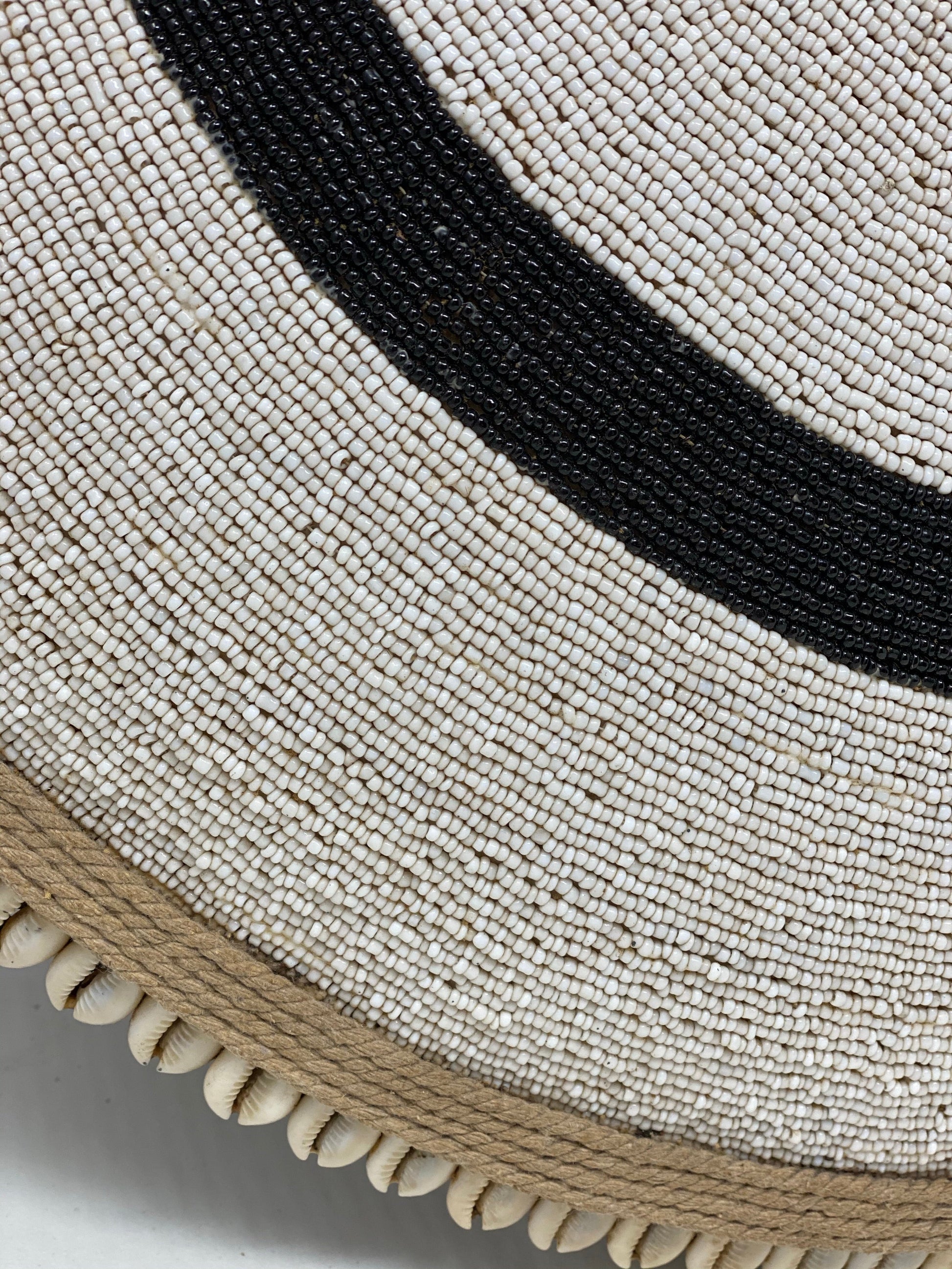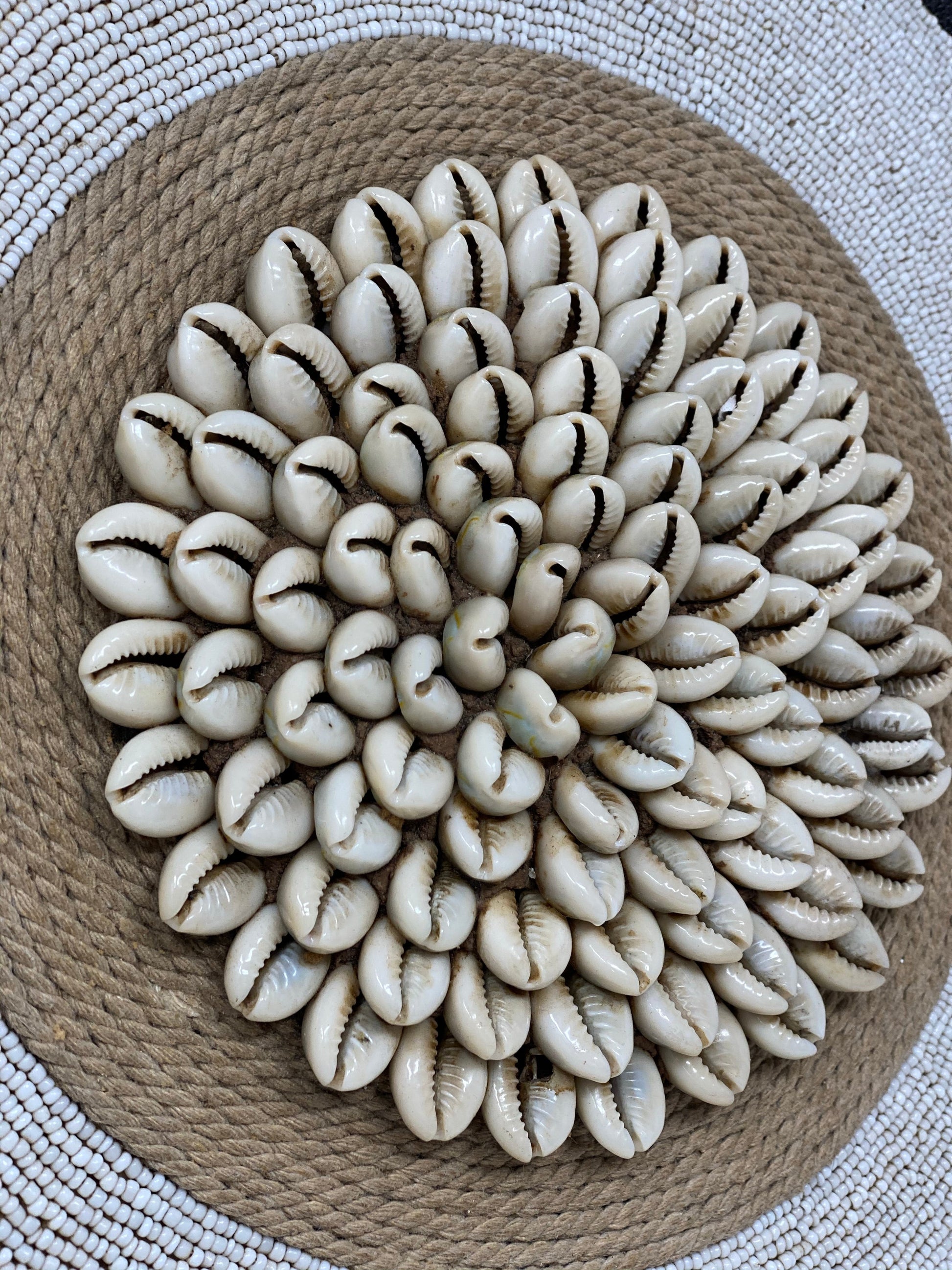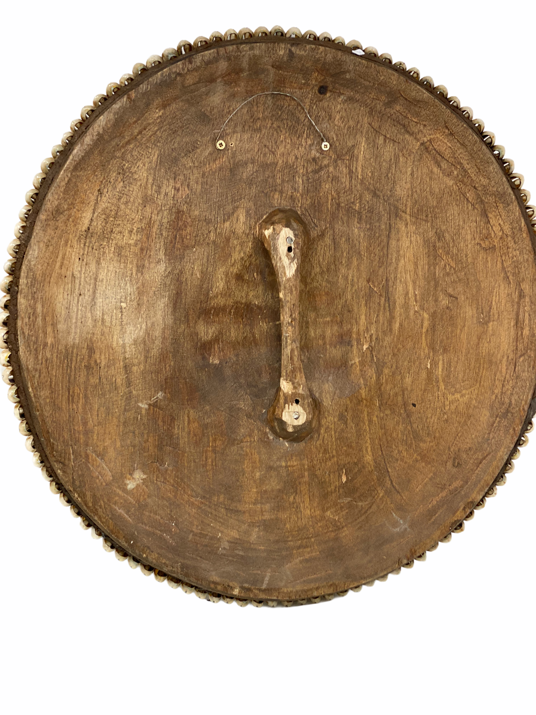 Historically used as a defensive weapon in wartime and displayed as a decorative symbol of status and wealth by the Tikar people in Cameroon. Meticulously crafted, carved from one solid piece of Baobab wood, a sacred wood used for medicinal and ritual purposes for centuries, this large shield boasts hundreds of hand-placed beads on manila string in a circular pattern around a dimensional cluster of natural cowrie shells in the centre. These decorative shields are one-of-a-kind, collaboratively crafted by a large group of people to make each piece truely unique and
