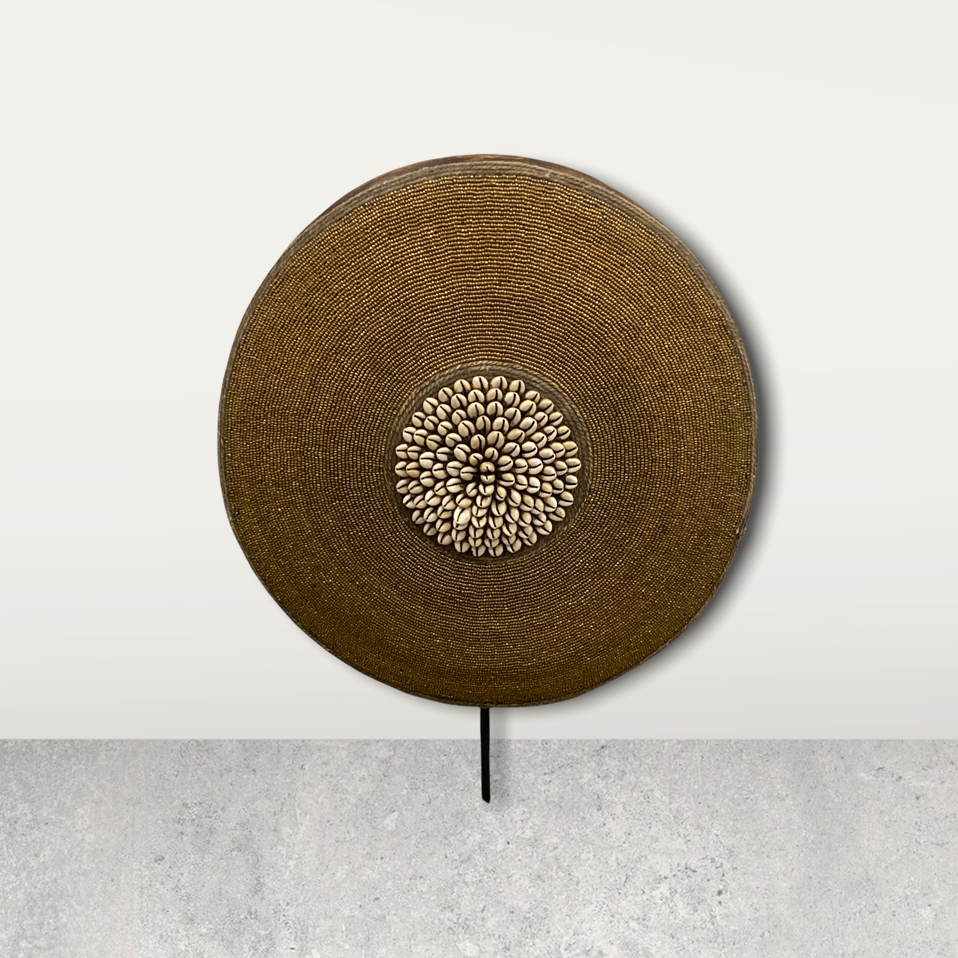 The geometric designs were used to confuse enemies due to their dizzying effects. This shield is so pretty with a cowrie shell in the centre and thousands of beads.