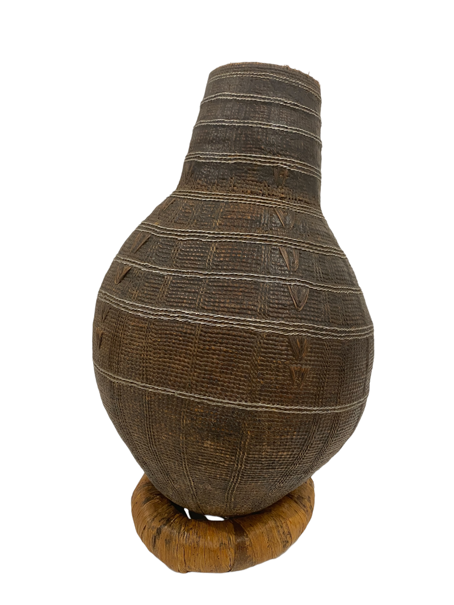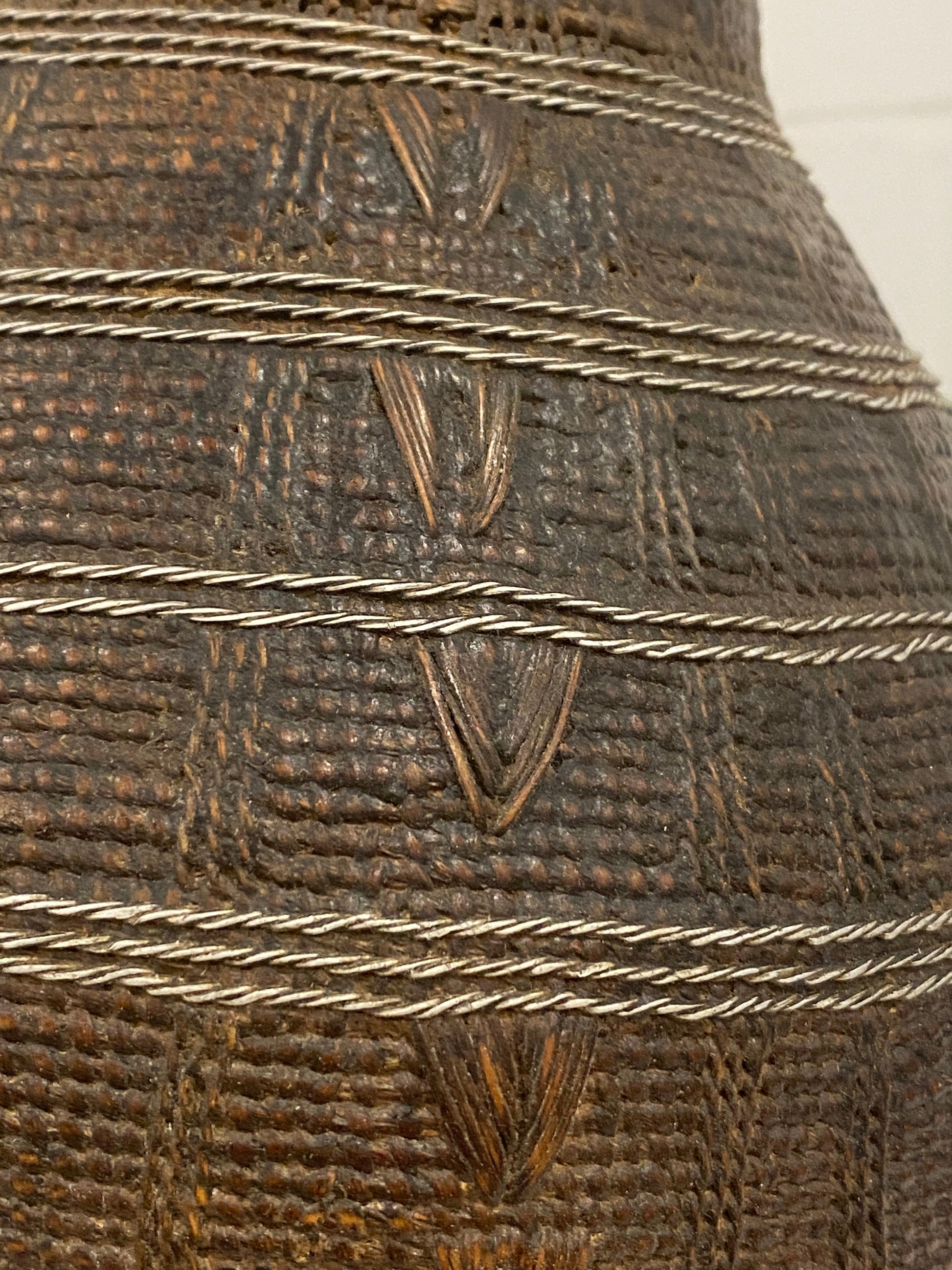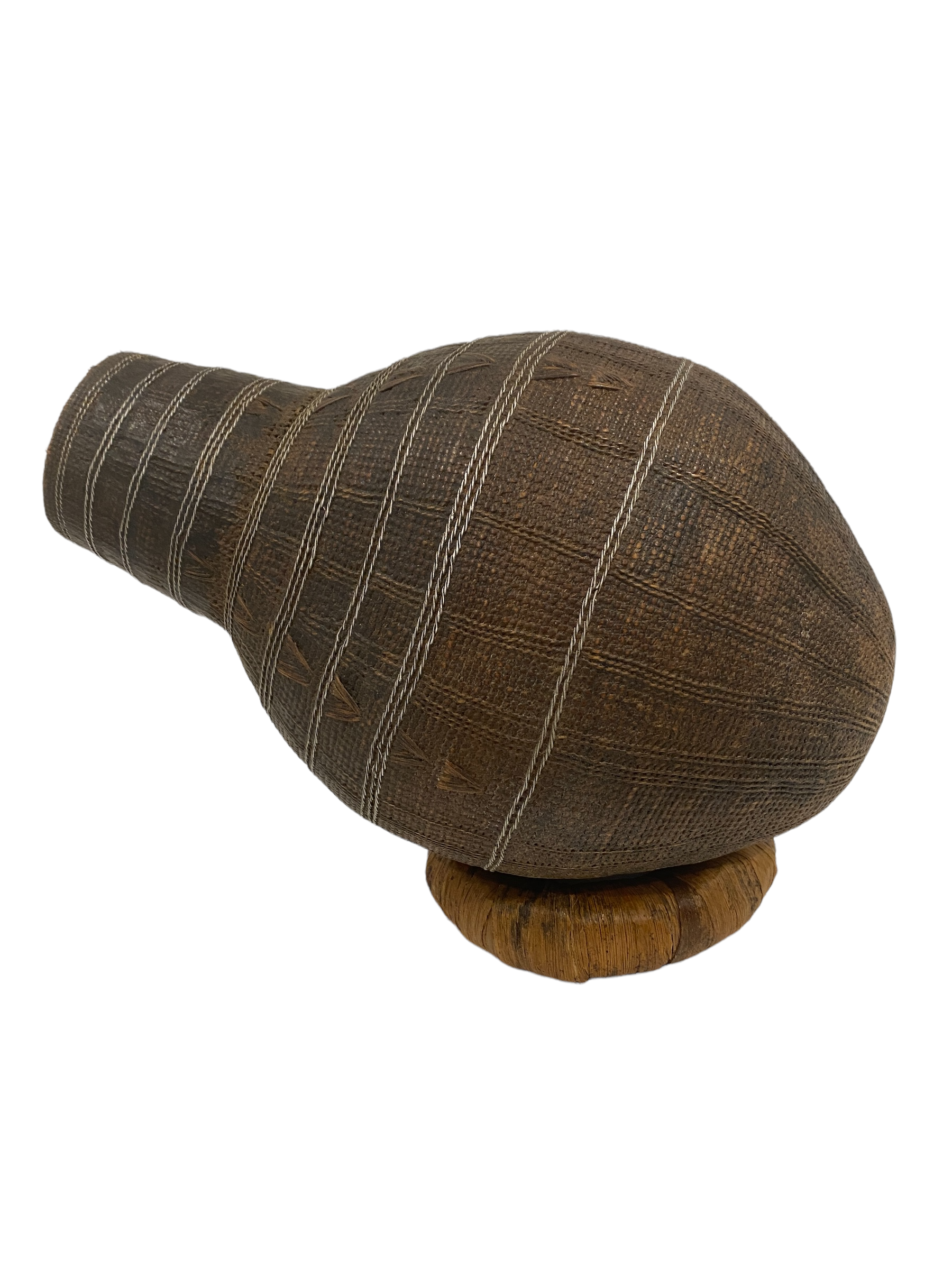 A Chocho or Gorfa milk jug is handmade using traditional Ethiopian techniques with woven sisal fiber and aluminum wire, and is waterproofed with beeswax. An attractive pear shaped art piece for the perfect interior design piece.