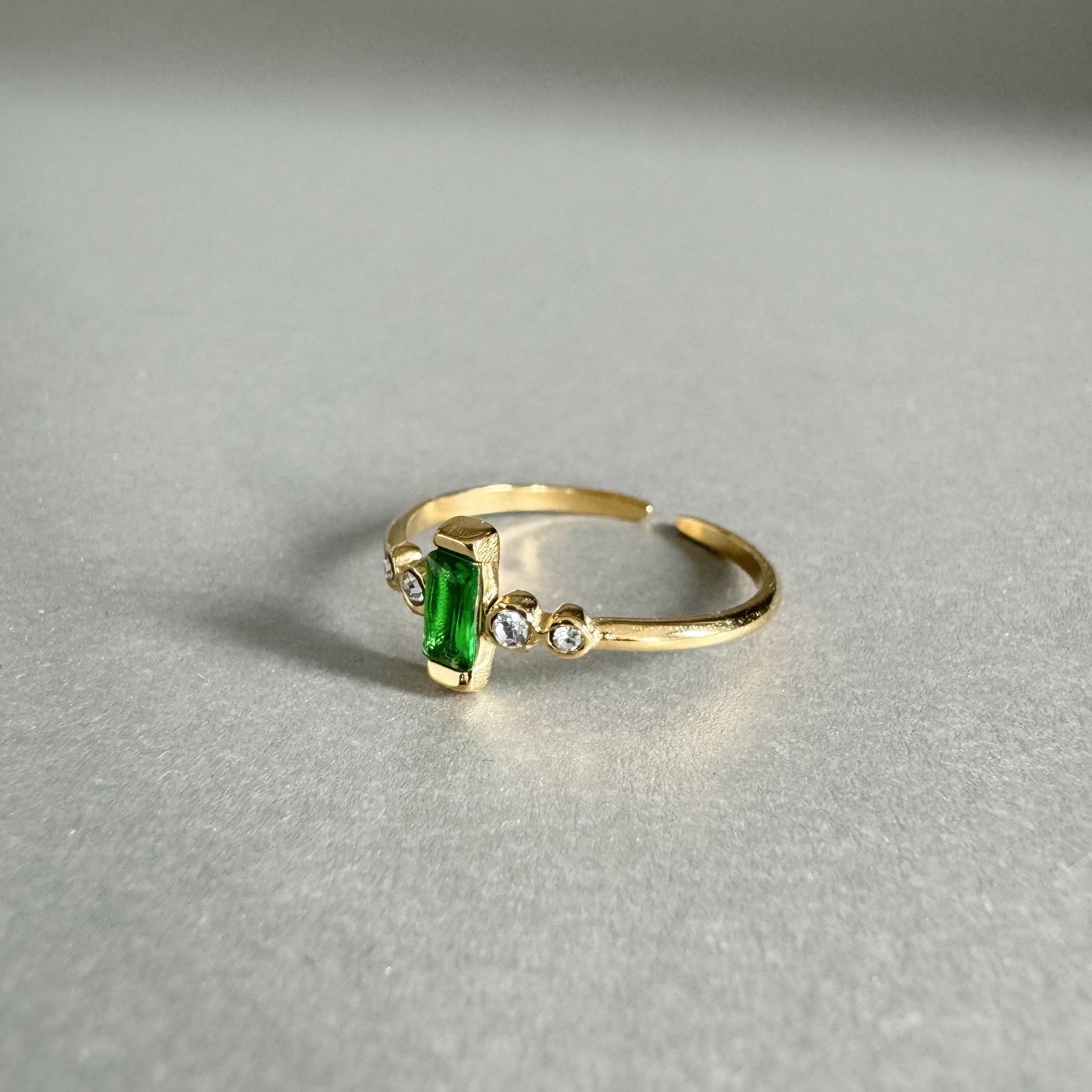 Add a touch of luxury and charm to your outfit with the Clarissa Luxe 18k Gold Plated Jewel Ring. This dainty ring features a stunning emerald colour green jewel that will catch everyone's eye.