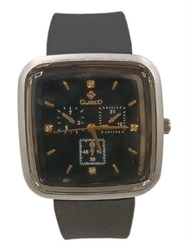 Clasico Mens Ladies Water Resistant Square Silver Case Black Dial Black Rubber Strap Watch