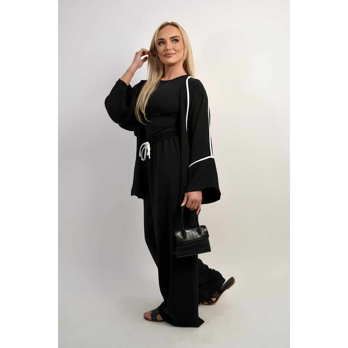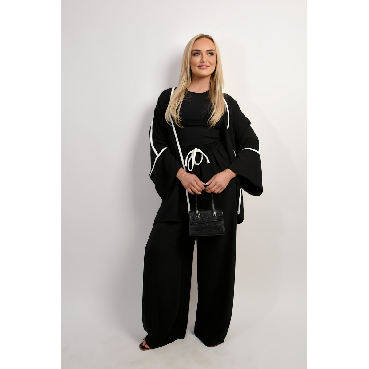 The Linda Contrast Trim Oversized Cardigan and Wide Leg Co-ord Set is all about cozy vibes! The cardigan is oversized, which makes it super comfy and perfect for lounging or going out. The wide-leg pants are stylish and easy to wear, making your look effortless. You can mix and match this set with other tops and shoes, too. You'll feel great and look cute no matter where you go!