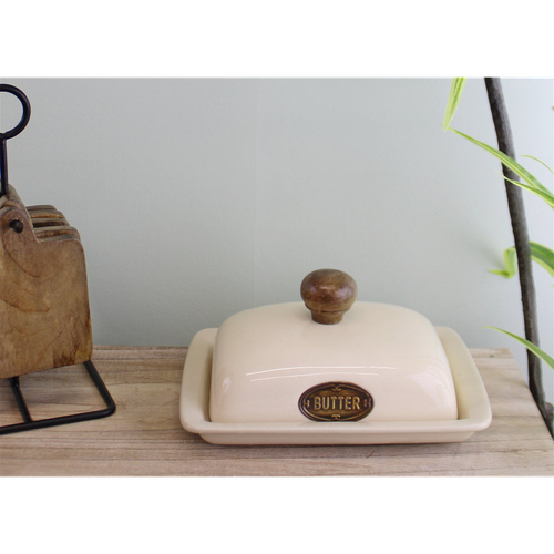 A high quality ceramic butter dish in a rustic cream colour, part of our Country Cottage range. The butter dish is 100% ceramic with a metal butter label fixed to the front and a mango wood knob to the top. Co-ordinates with items in the Country Cottage range. Measurements: 15 x 10 x 19.5cm