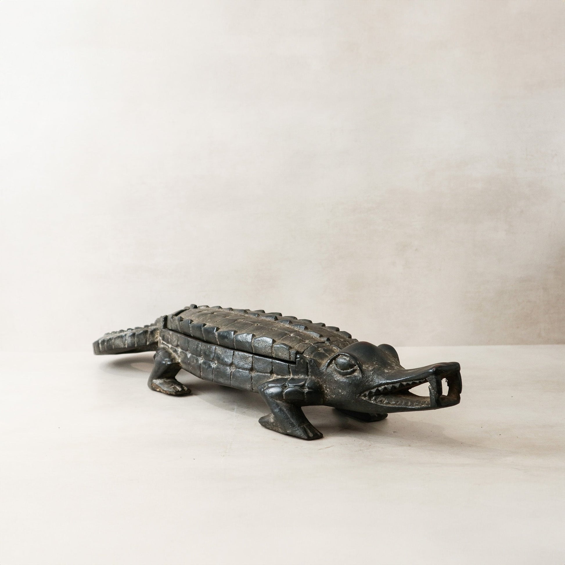 Presenting an exquisite lidded Mancala board fashioned in the likeness of a majestic crocodile, meticulously carved from wood and adorned with 2 x 6 holes. This captivating piece commands attention with its intricate craftsmanship and symbolic significance.