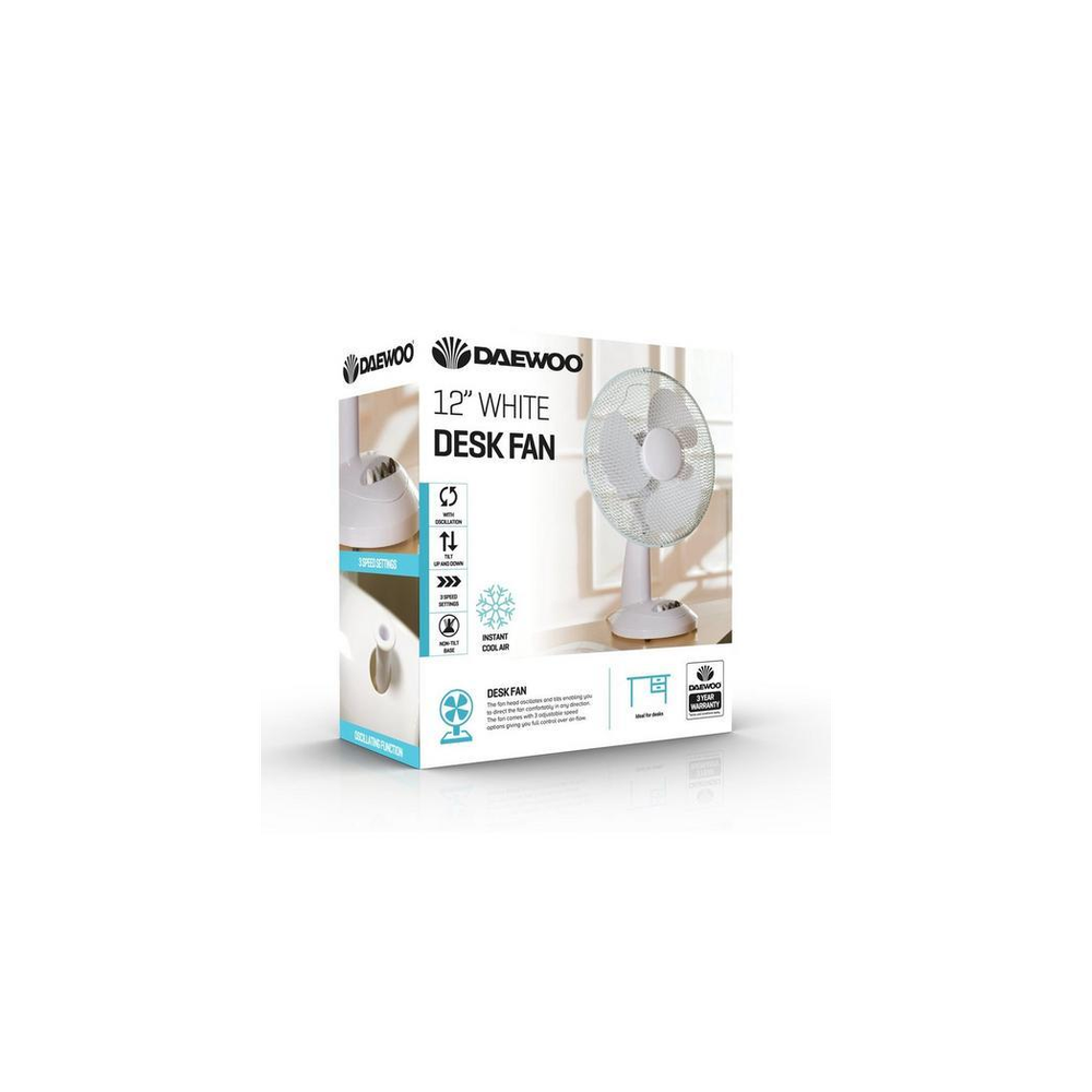 Daewoo 12" White Desk Fan - Stay Cool with Powerful Airflow - 3 Speed Settings - Ideal for Home or Office