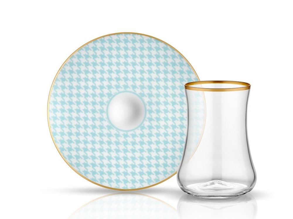 Dervish Tartan Blue Tea Glass and Saucer - Gold Rim