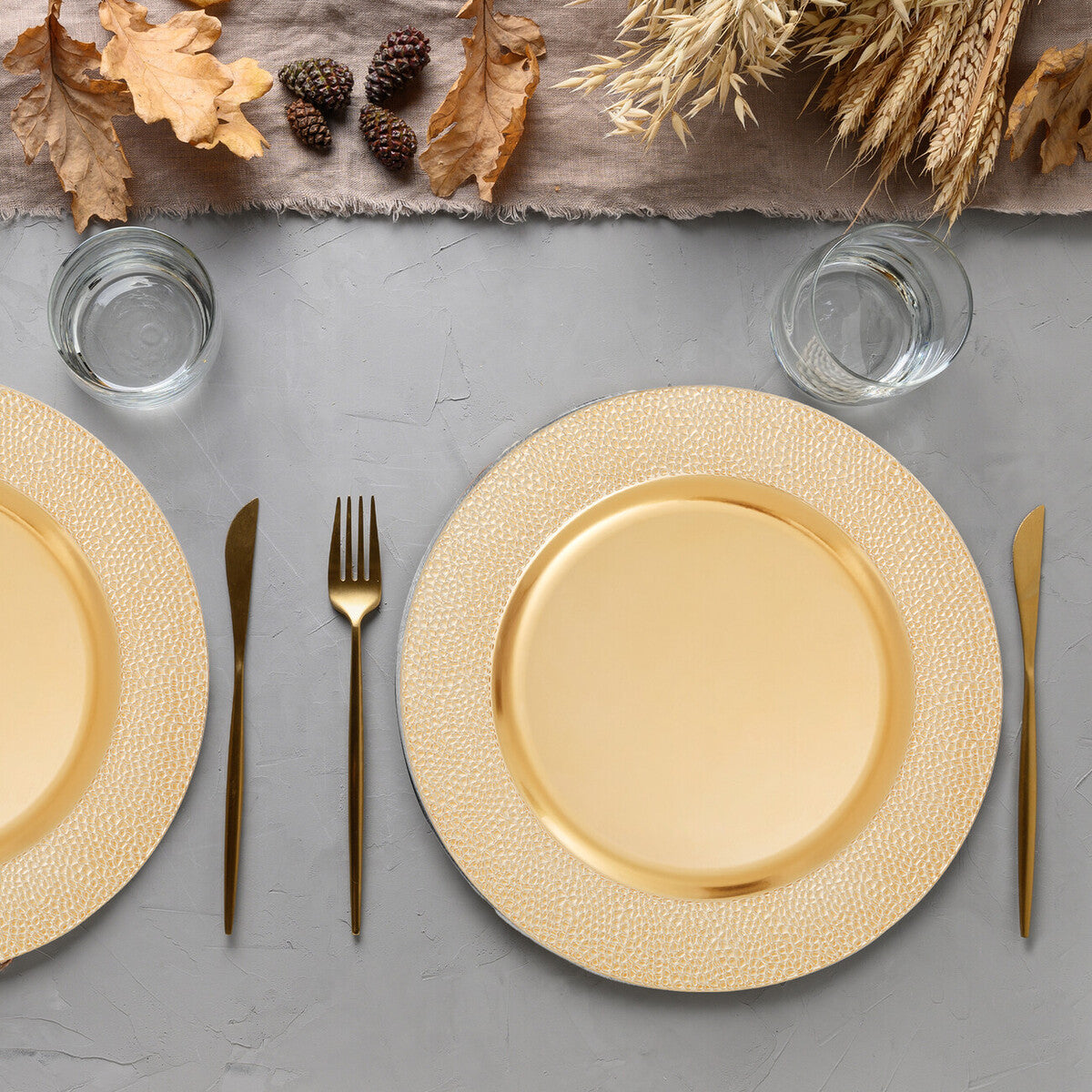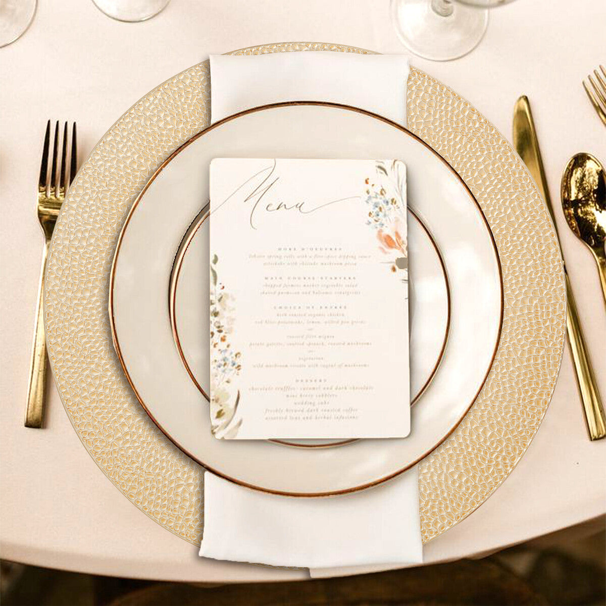 Anchor each place with the gold charger plate and neutral napery; stack on a console for buffet service; or mix alternating gold and white chargers for a tailored stripe effect down the table.