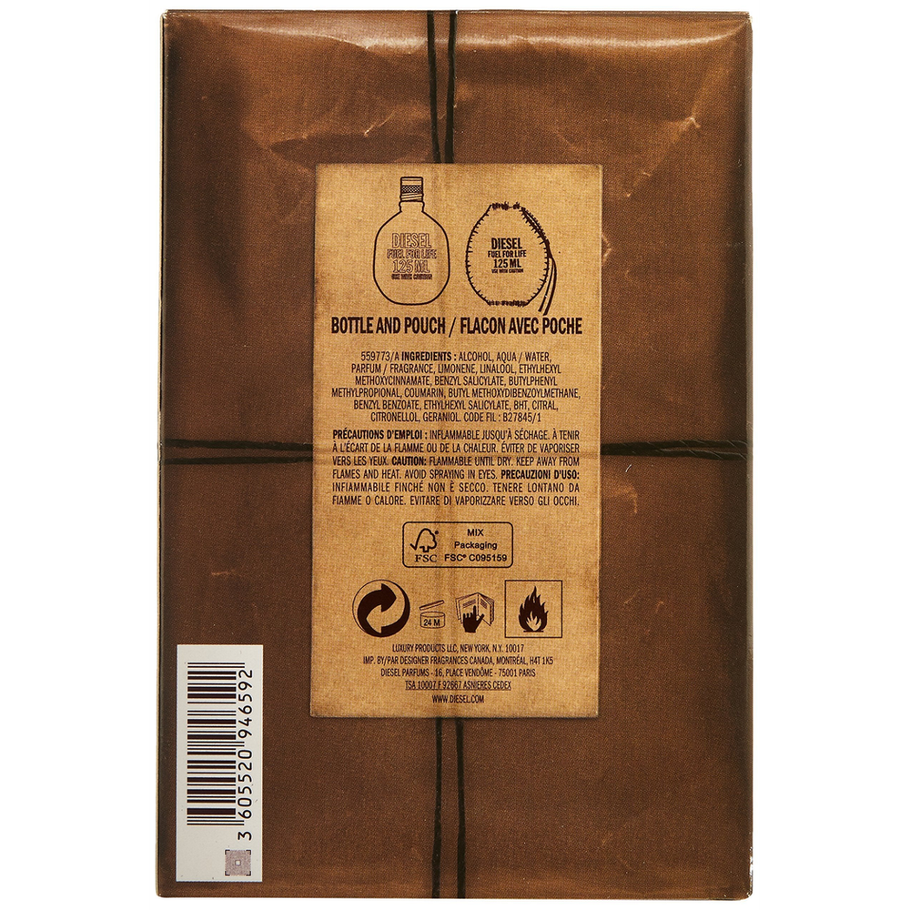 Diesel Fuel for Life Pour Homme Eau De Toilette Spray comes in a distinctive 125ml bottle. The design features a modern and edgy aesthetic, reflecting the bold and adventurous spirit of the fragrance. The bottle is styled with a metal-like cap and embossed with the Diesel logo, emphasizing the brand’s commitment to style and innovation.