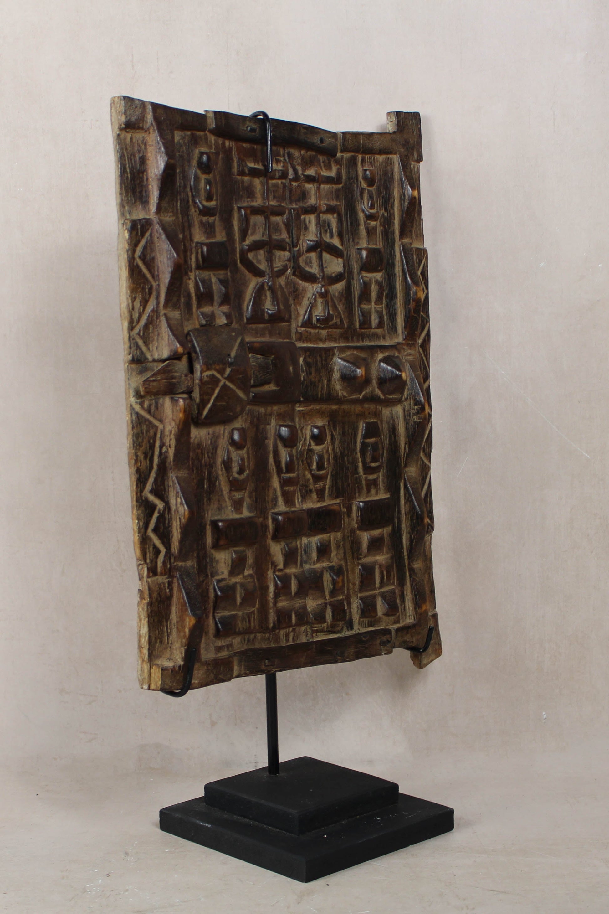 Dogon granary doors originate from the Dogon people of the Bandiagara Escarpment region of Mali. These doors protected the window-like opening into each family's grain storage building, and used a simple sliding door lock. Primordial beings, ancestors, Kanaga masks, sun lizards and scenes of life symbolically served to protect the entrance by making it sacrosanct.