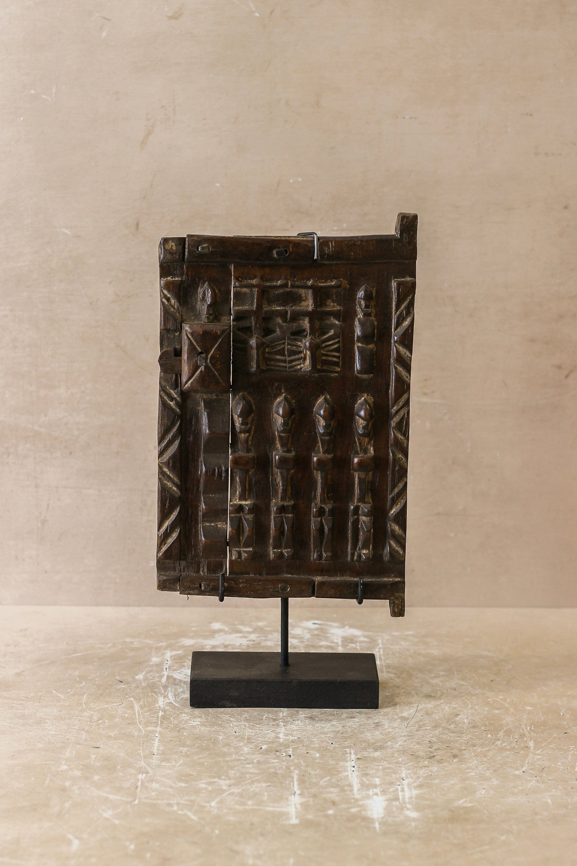 Dogon granary doors originate from the Dogon people of the Bandiagara Escarpment region of Mali. These doors protected the window-like opening into each family's grain storage building, and used a simple. sliding door lock. Primordial beings, ancestors, Kanaga masks, sun lizards and scenes of life symbolically. served to protect the entrance by making it sacrosanct.