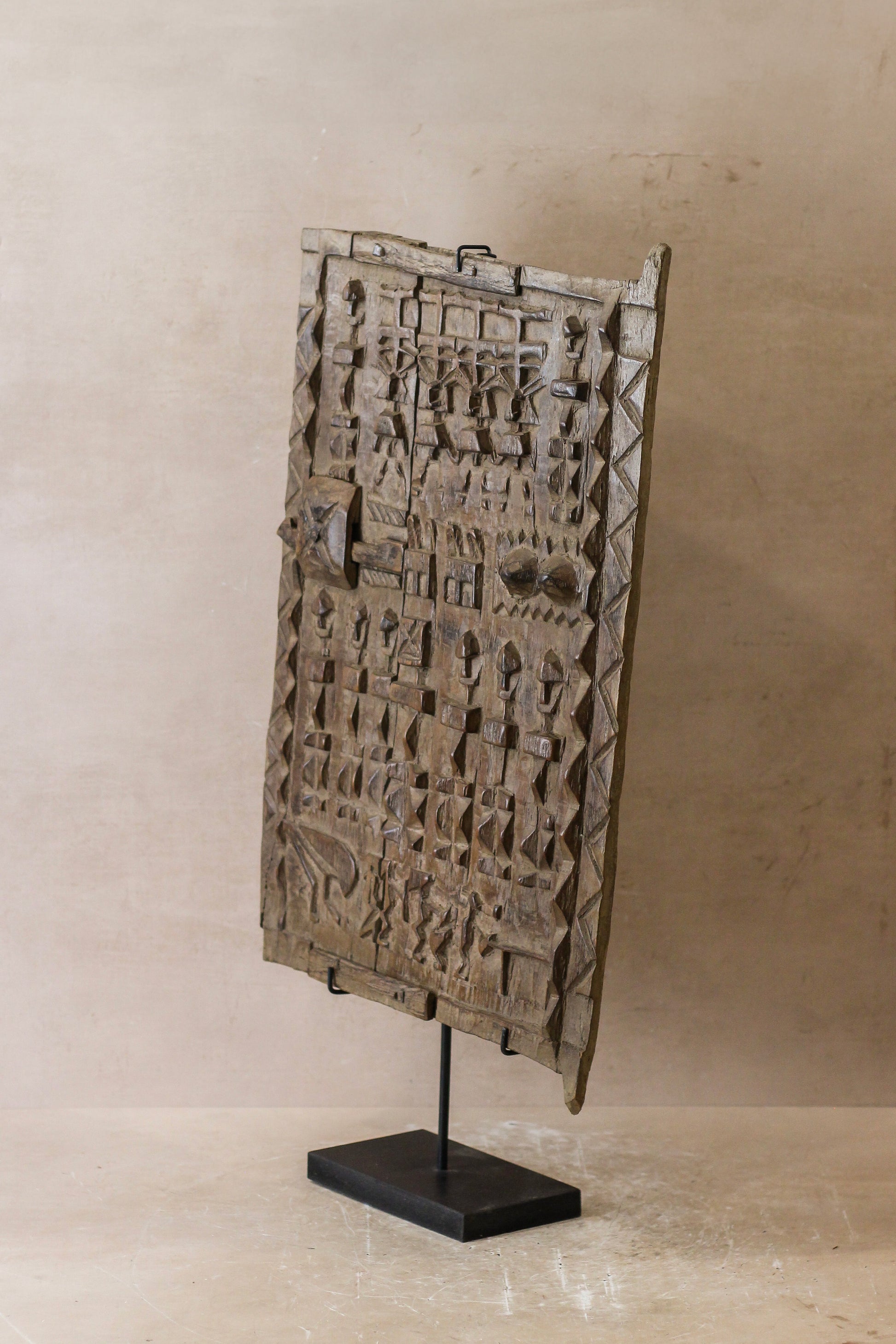 Dogon granary doors originate from the Dogon people of the Bandiagara Escarpment region of Mali. These doors protected the window-like opening into each family's grain storage building, and used a simple sliding door lock. Primordial beings, ancestors, Kanaga masks, sun lizards and scenes of life symbolically served to protect the entrance by making it sacrosanct.