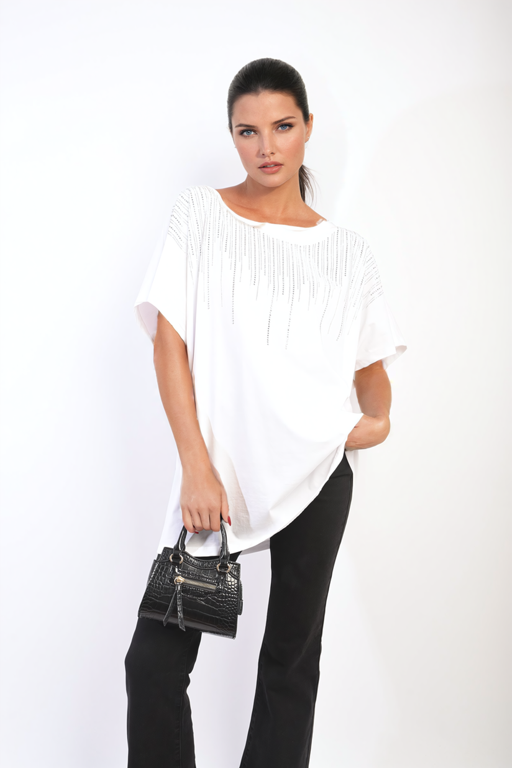 ✨ Featuring an embellished neckline, this top adds a hint of glamour to your outfit. The short sleeves make it perfect for warm weather or layering under jackets and cardigans.