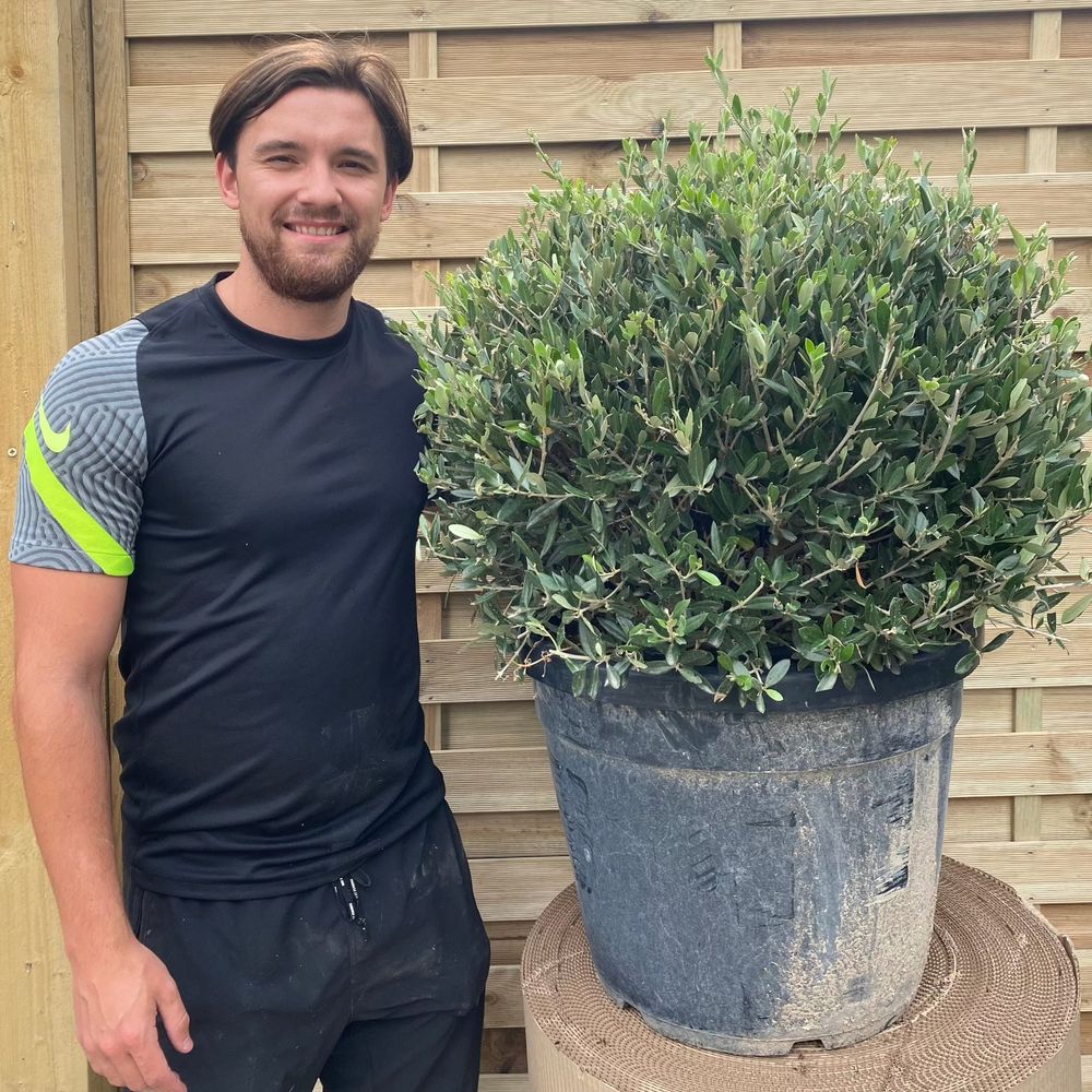 A mature olive ball, currently at a height of 90cm including 55L growers pot.
