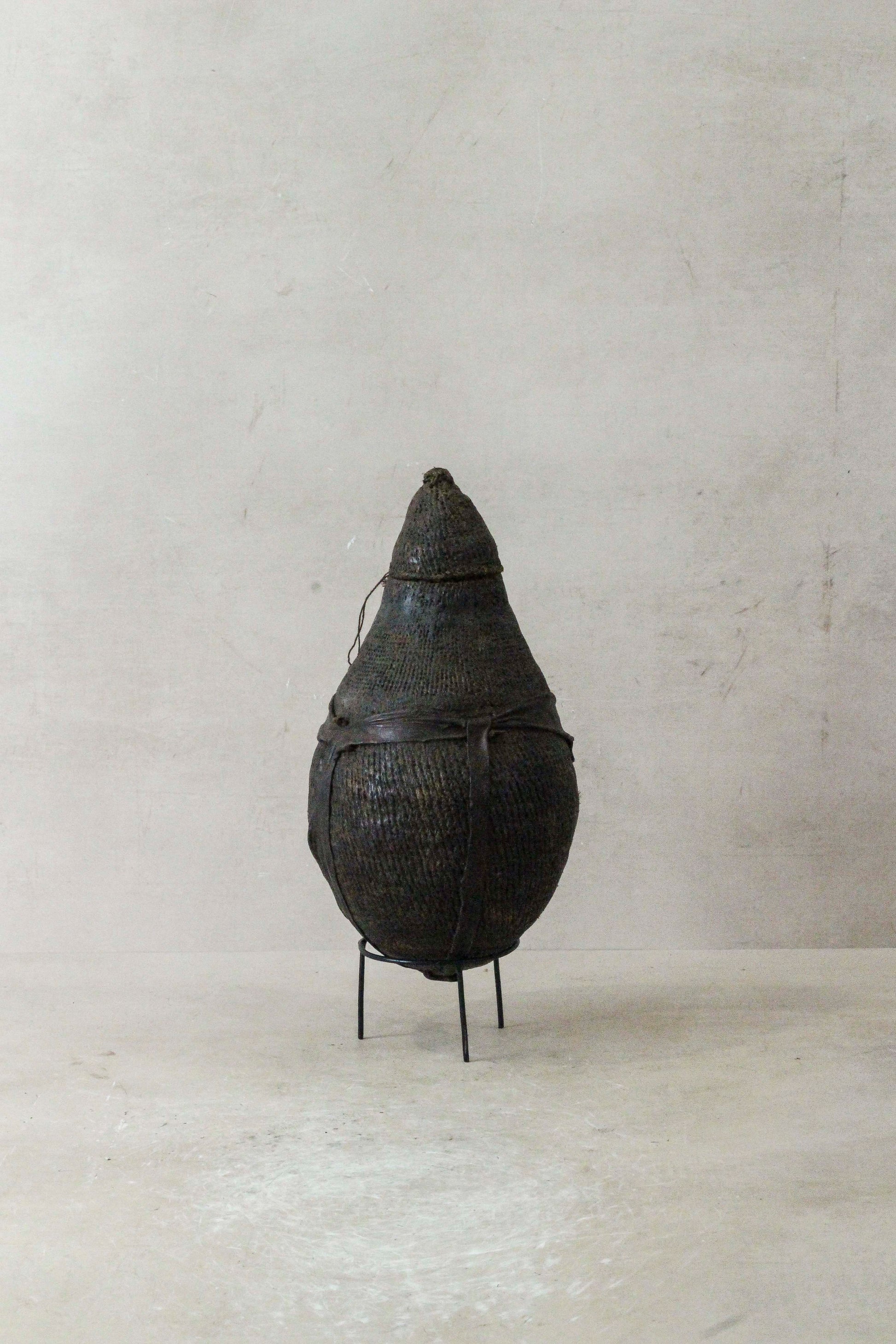 This antique Ethiopian Cho Cho basket is hand crafted by the Borana people using a combination of wire, rattan and mud. They are used to serve drinks to guests. They make for a beautiful piece of art cones with its own stand.