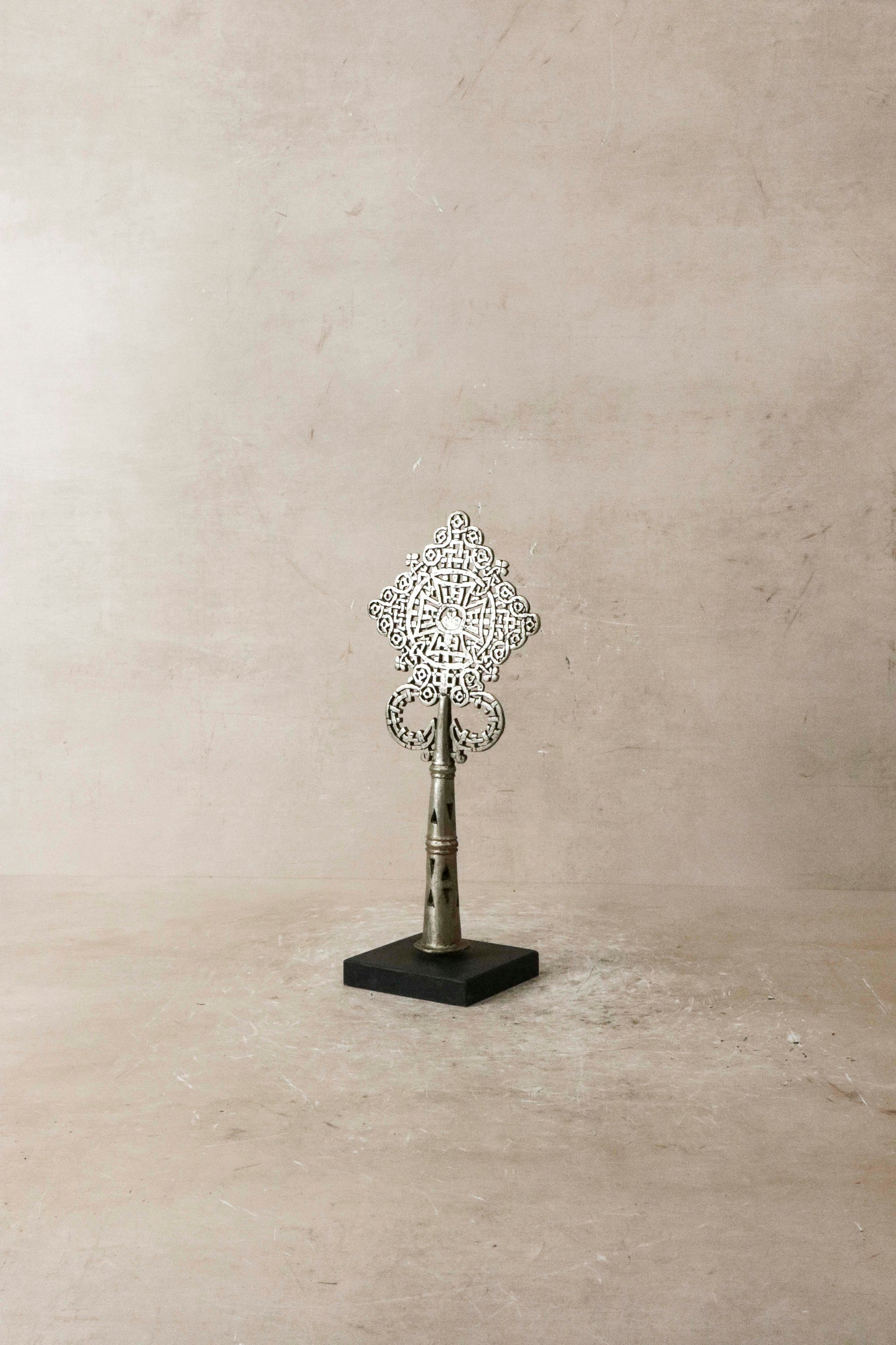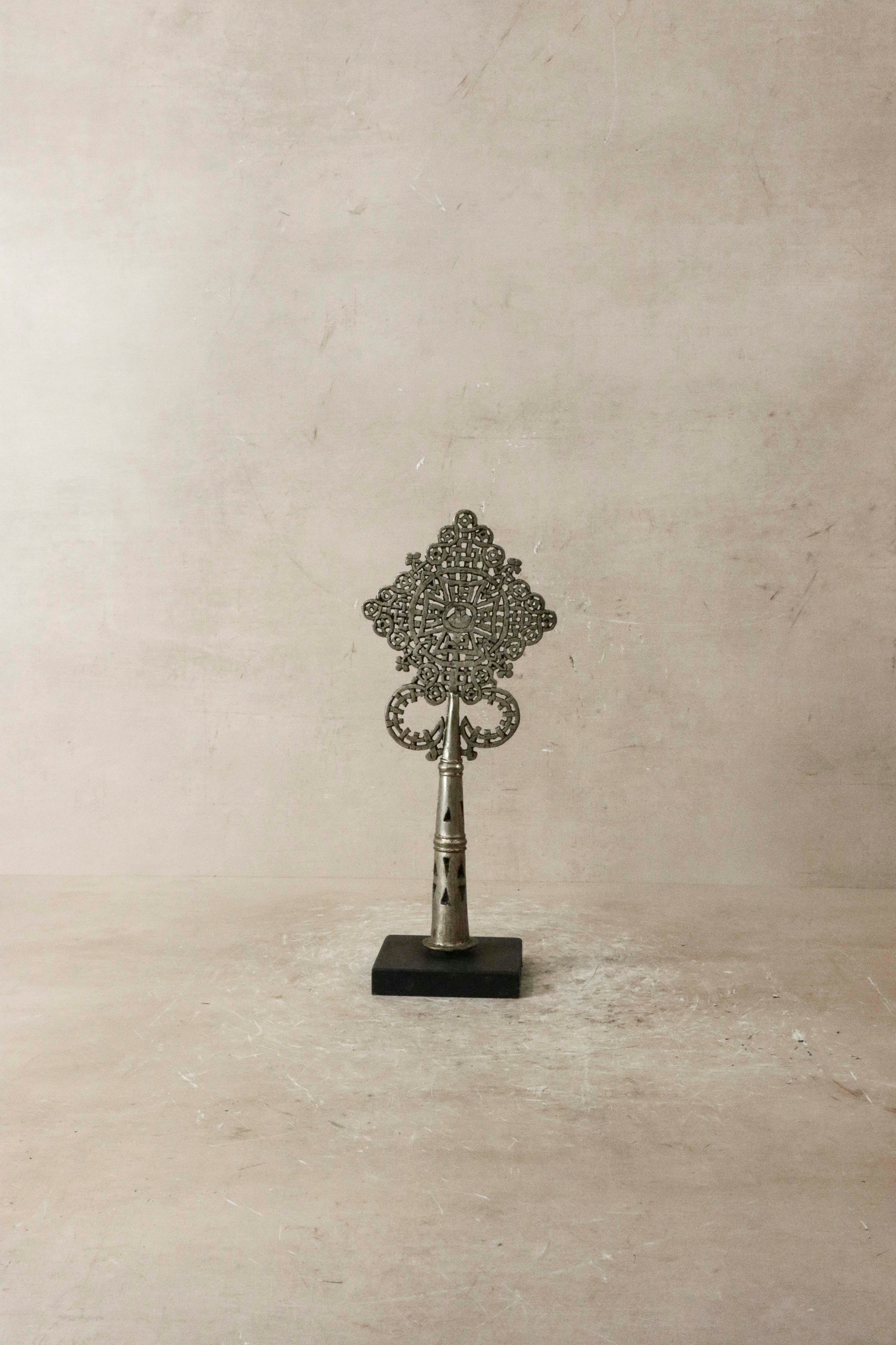 Ethiopia is home to one of the oldest continuous Christian traditions in the world, and Ethiopian silversmiths produce religious jewellery as an expression of that tradition. Star of David symbols are evident in design and emphasize the relationship of Christian Ethiopians to Israel, King Solomon and the Queen of Sheba. These individual Coptic crosses are cast and made in various styles, designs, and sizes. They can be hand-cut from various metal: silver, iron, gold, and brass--and cast using the lost wax method. Some Ethiopian crosses are made from wood, these ones are made of silver alloy. Designs are as varied as the regions they come from, and crosses are generally named after the towns or provinces where they are made. The use of these crosses is essentially religious. Crosses like these are known as processional crosses. They do have base and are carried during religious