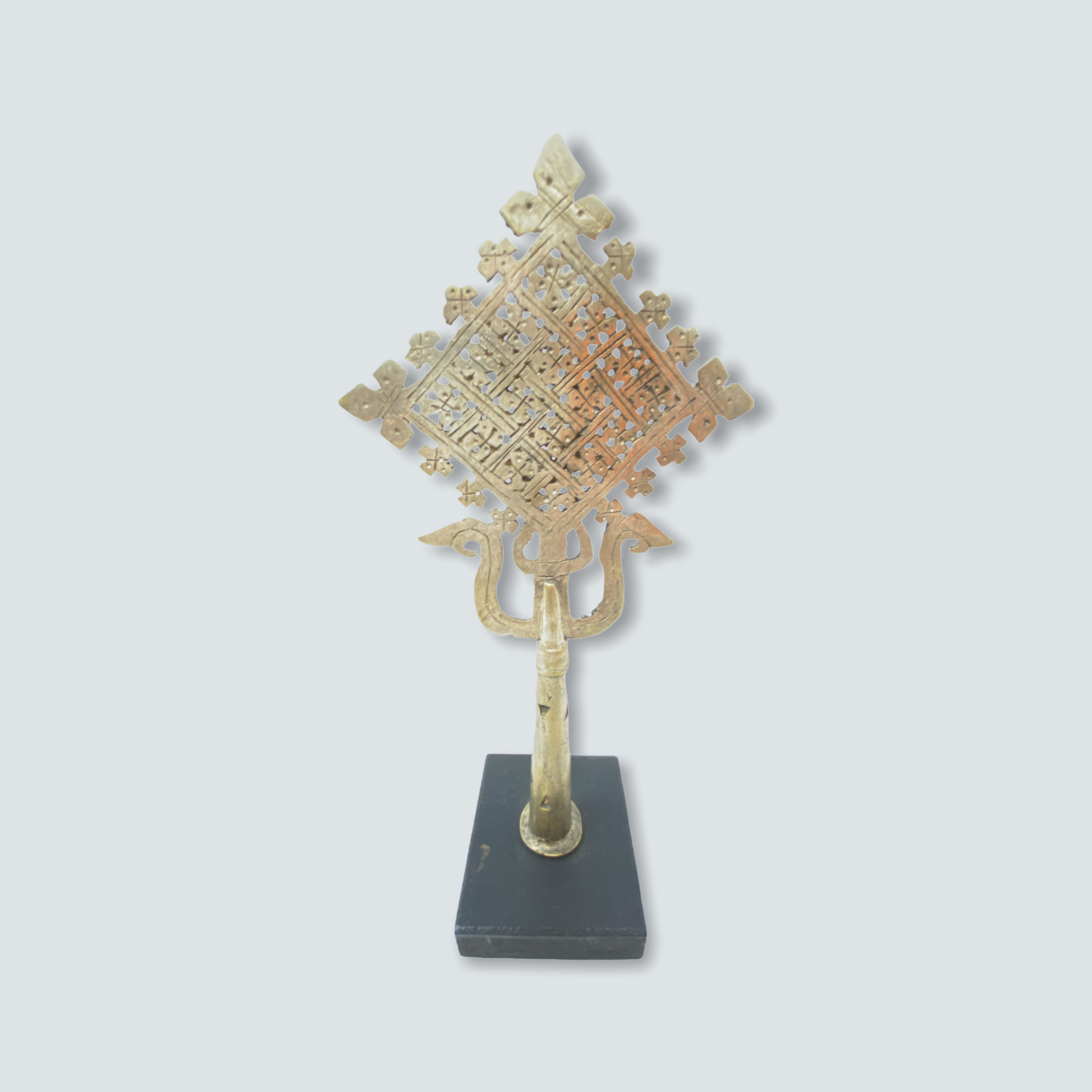 Ethiopia is home to one of the oldest continuous Christian traditions in the world, and Ethiopian silversmiths produce religious jewellery as an expression of that tradition. Star of David symbols are evident in design and emphasize the relationship of Christian Ethiopians to Israel, King Solomon and the Queen of Sheba. These individual Coptic crosses are cast and made in various styles, designs, and sizes. They can be hand-cut from various metal: silver, iron, gold, and brass--and cast using the lost wax method. Some Ethiopian crosses are made from wood, these ones are made of silver alloy. Designs are as varied as the regions they come from, and crosses are generally named after the towns or provinces where they are made. The use of these crosses is essentially religious. Crosses like these are known as processional crosses. They do have base and are carried during religious