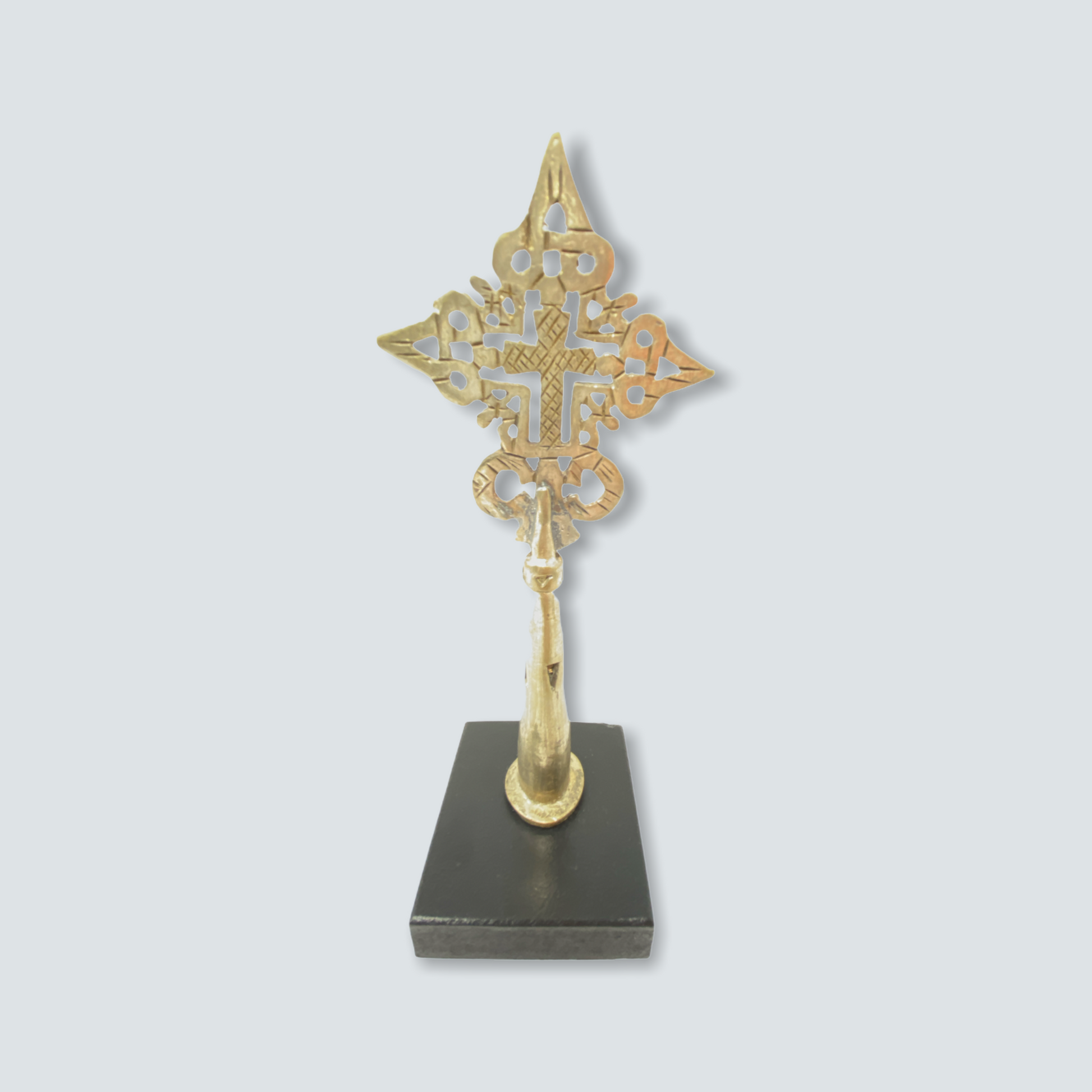 Ethiopia is home to one of the oldest continuous Christian traditions in the world, and Ethiopian silversmiths produce religious jewellery as an expression of that tradition. Star of David symbols are evident in design and emphasize the relationship of Christian Ethiopians to Israel, King Solomon and the Queen of Sheba. These individual Coptic crosses are cast and made in various styles, designs, and sizes. They can be hand-cut from various metal: silver, iron, gold, and brass--and cast using the lost wax method. Some Ethiopian crosses are made from wood, these ones are made of silver alloy. Designs are as varied as the regions they come from, and crosses are generally named after the towns or provinces where they are made. The use of these crosses is essentially religious. Crosses like these are known as processional crosses. They do have base and are carried during religious