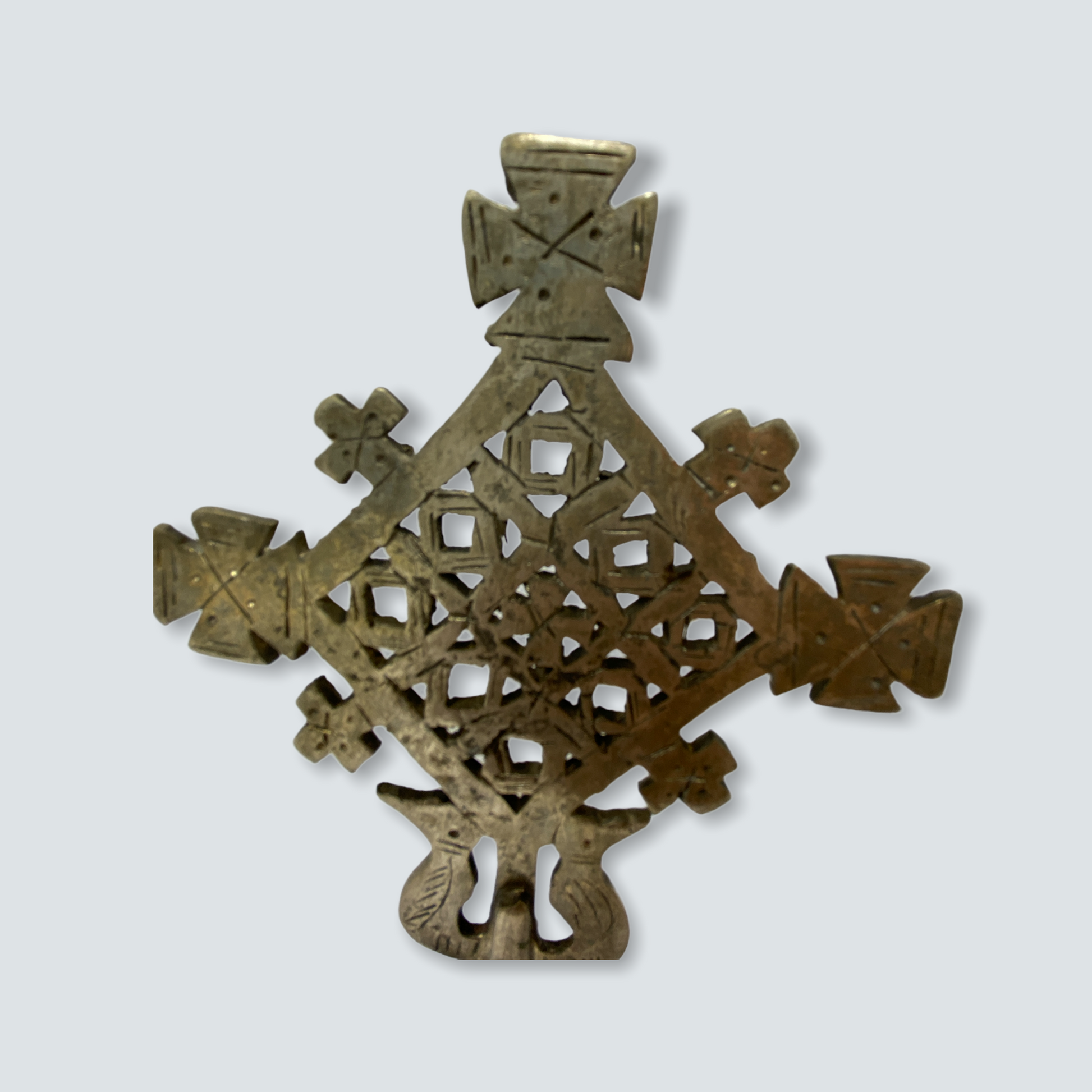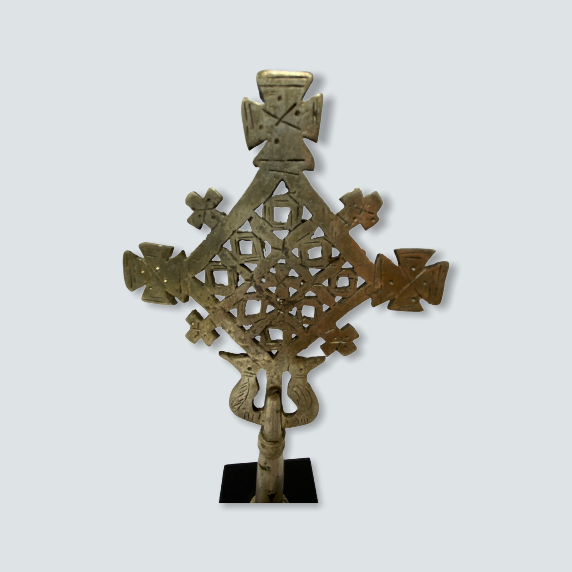Ethiopia is home to one of the oldest continuous Christian traditions in the world, and Ethiopian silversmiths produce religious jewellery as an expression of that tradition. Star of David symbols are evident in design and emphasize the relationship of Christian Ethiopians to Israel, King Solomon and the Queen of Sheba. These individual Coptic crosses are cast and made in various styles, designs, and sizes. They can be hand-cut from various metal: silver, iron, gold, and brass--and cast using the lost wax method. Some Ethiopian crosses are made from wood, these ones are made of silver alloy. Designs are as varied as the regions they come from, and crosses are generally named after the towns or provinces where they are made. The use of these crosses is essentially religious. Crosses like these are known as processional crosses. They do have base and are carried during religious