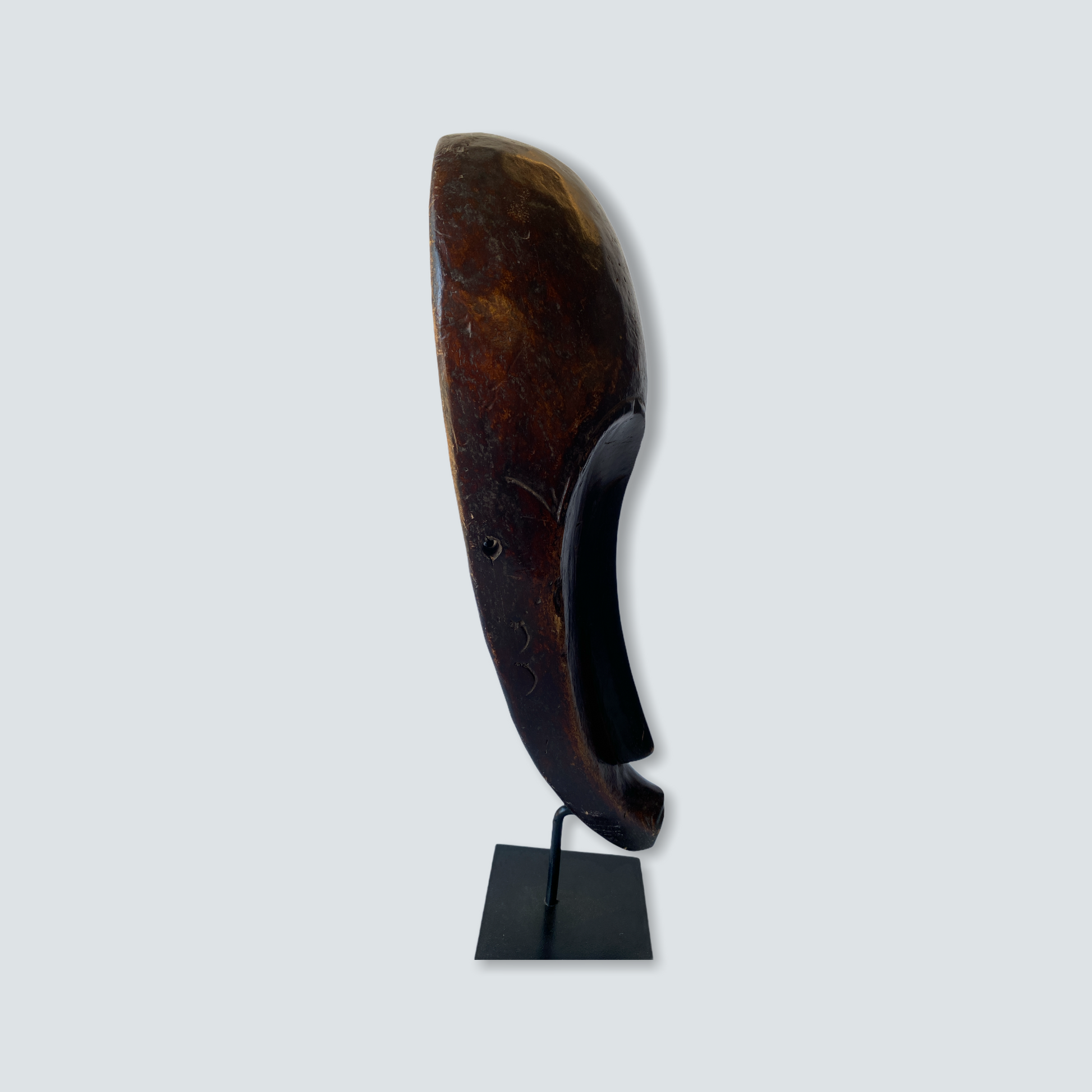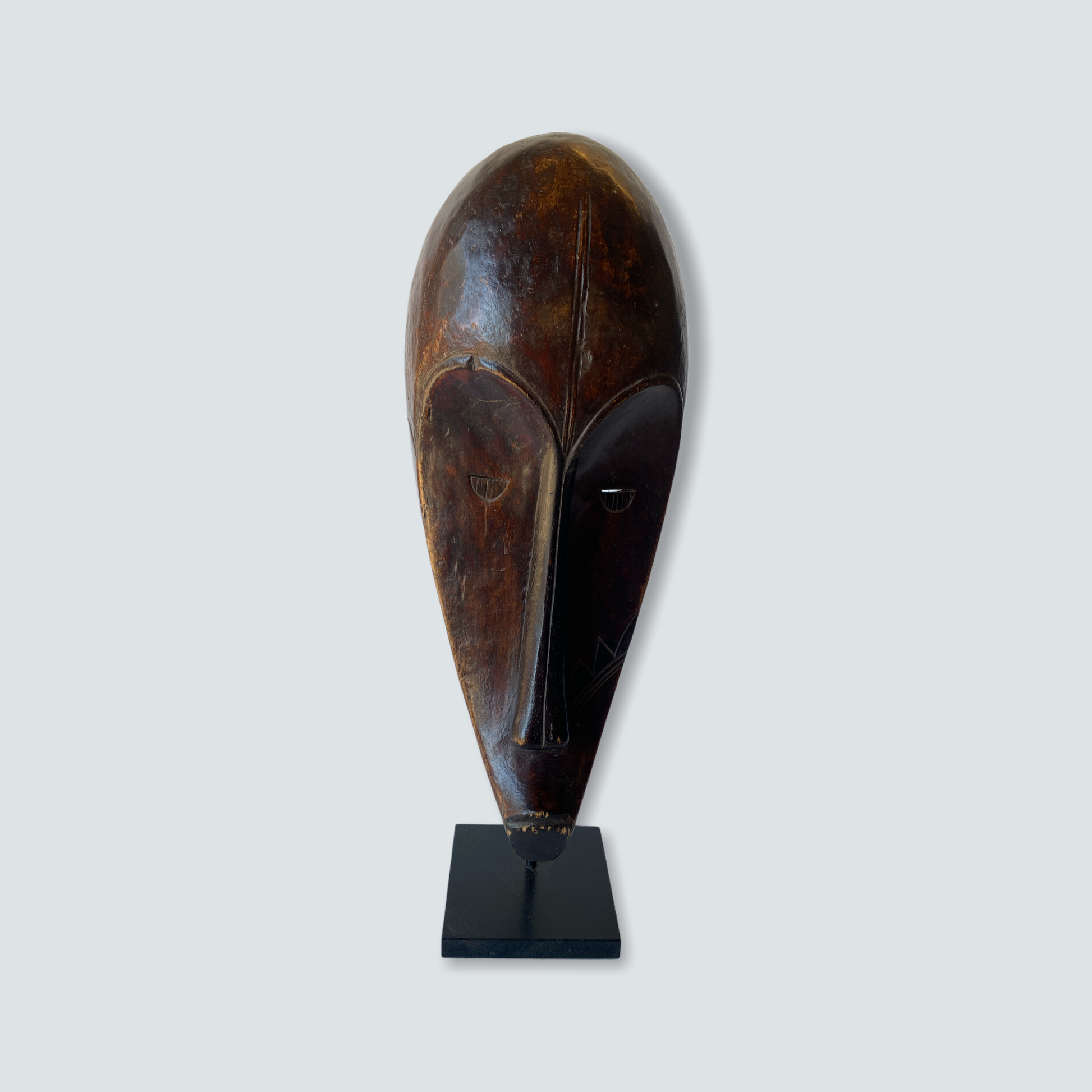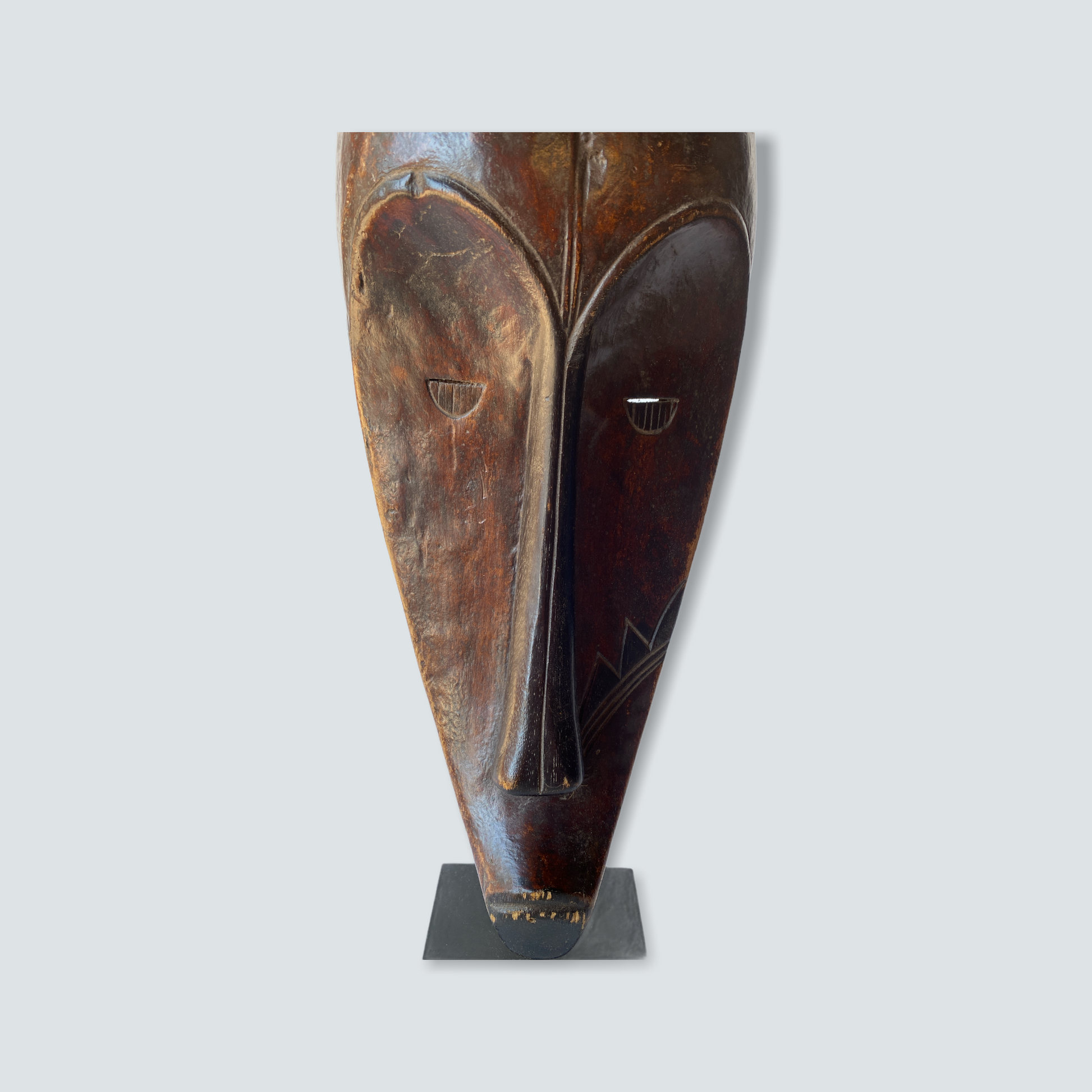 Well known for their reliquary figures the Fang also danced finely sculpted masks during a number of ritual activities. Among the Fang, white-painted masks identified with the Ngil society are known for their elegant abstractions of the human face. Ngil masks have been described as having a 'heart-shaped face' due to the facial features emphasizing refined curves of the orbital ridges above the eyes and the prominent line of the long tapering nose that ended above a discretely mouth carved at the bottom of the chin that completes the abstraction of the face. The Fang people used masks in their secret societies. Members of this male society wore the Ngil masks during the initiation of new members and the persecution of wrongdoers. Masqueraders, clad in raffia costumes and attended by helpers, would materialize in the village after dark, illuminated by flickering torchlight.
