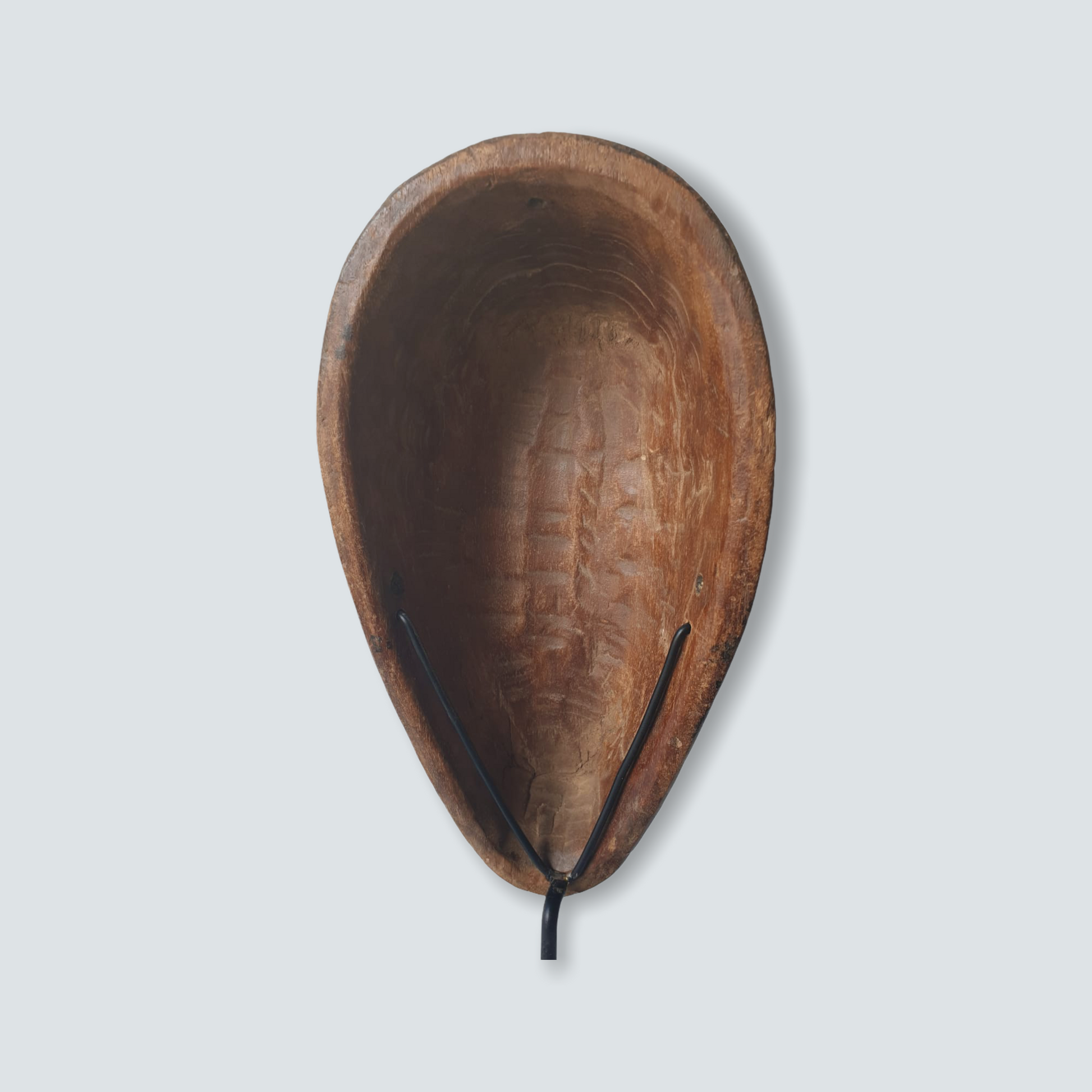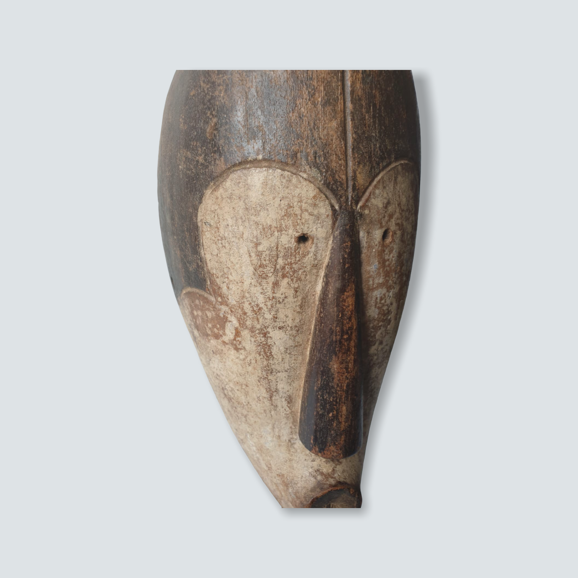 Well known for their reliquary figures the Fang also danced finely sculpted masks during a number of ritual activities. Among the Fang, white-painted masks identified with the Ngil society are known for their elegant abstractions of the human face. Ngil masks have been described as having a 'heart-shaped face' due to the facial features emphasizing refined curves of the orbital ridges above the eyes and the prominent line of the long tapering nose that ended above a discretely mouth carved at the bottom of the chin that completes the abstraction of the face. The Fang people used masks in their secret societies. Members of this male society wore the Ngil masks during the initiation of new members and the persecution of wrongdoers. Masqueraders, clad in raffia costumes and attended by helpers, would materialize in the village after dark, illuminated by flickering torchlight.