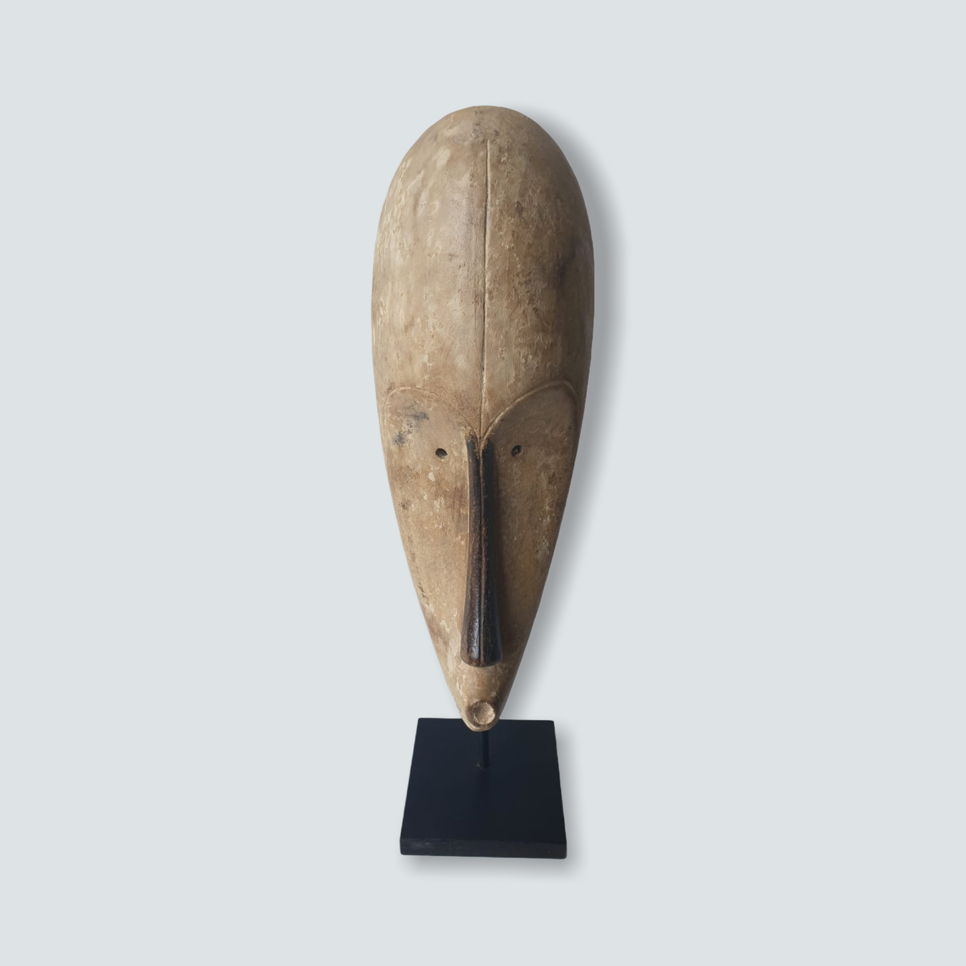 Well known for their reliquary figures the Fang also danced finely sculpted masks during a number of ritual activities. Among the Fang, white-painted masks identified with the Ngil society are known for their elegant abstractions of the human face. Ngil masks have been described as having a 'heart-shaped face' due to the facial features emphasizing refined curves of the orbital ridges above the eyes and the prominent line of the long tapering nose that ended above a discretely mouth carved at the bottom of the chin that completes the abstraction of the face. The Fang people used masks in their secret societies. Members of this male society wore the Ngil masks during the initiation of new members and the persecution of wrongdoers. Masqueraders, clad in raffia costumes and attended by helpers, would materialize in the village after dark, illuminated by flickering torchlight.