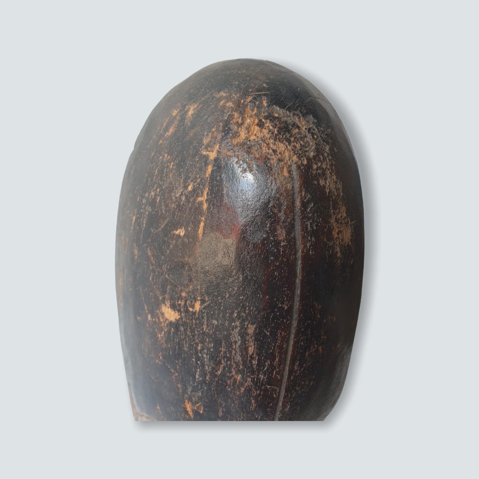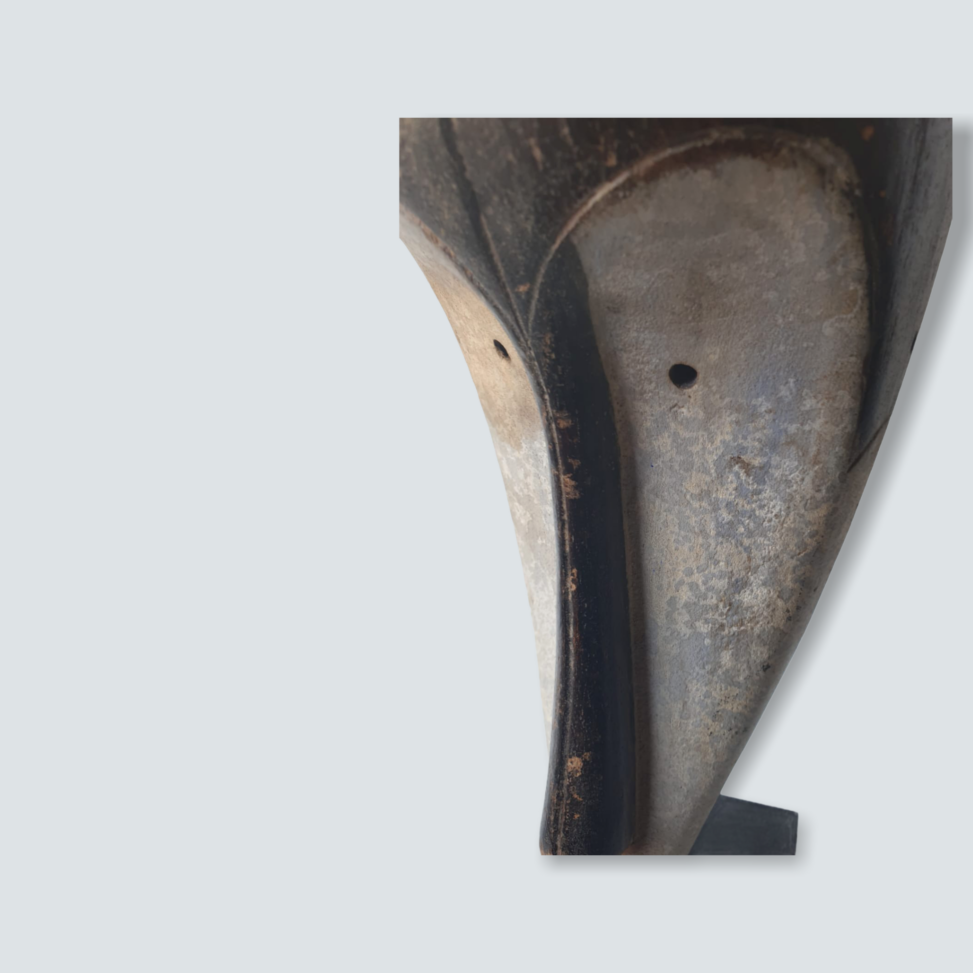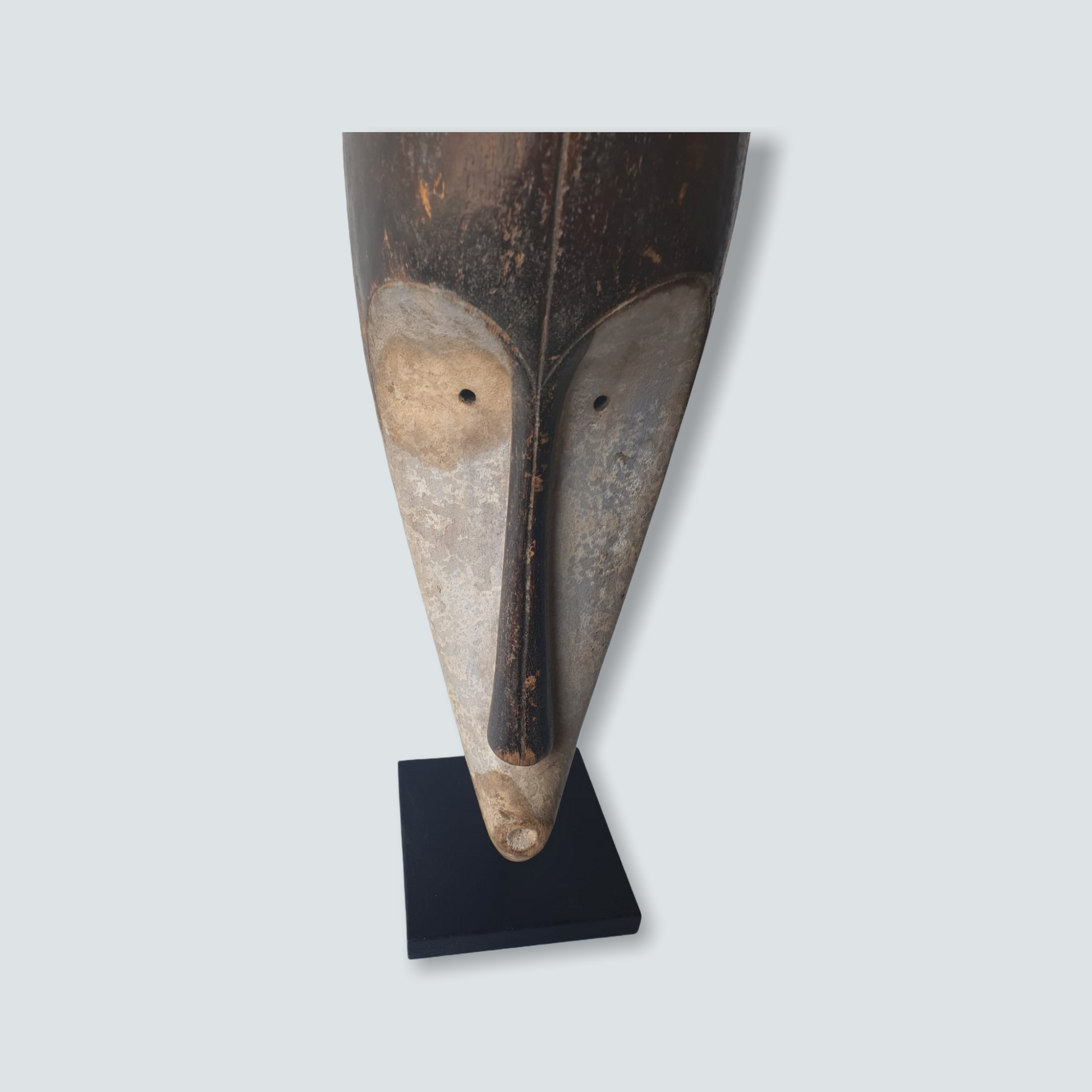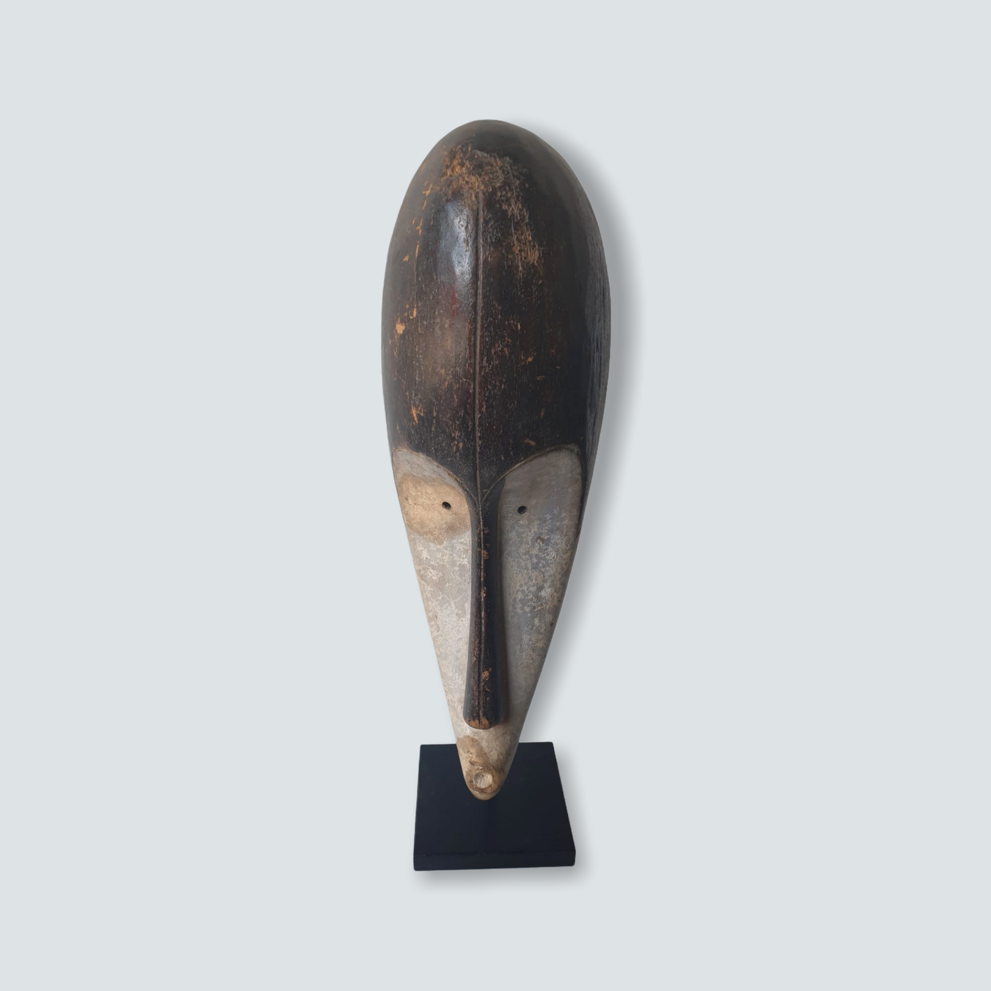 Well known for their reliquary figures the Fang also danced finely sculpted masks during a number of ritual activities. Among the Fang, white-painted masks identified with the Ngil society are known for their elegant abstractions of the human face. Ngil masks have been described as having a 'heart-shaped face' due to the facial features emphasizing refined curves of the orbital ridges above the eyes and the prominent line of the long tapering nose that ended above a discretely mouth carved at the bottom of the chin that completes the abstraction of the face. The Fang people used masks in their secret societies. Members of this male society wore the Ngil masks during the initiation of new members and the persecution of wrongdoers. Masqueraders, clad in raffia costumes and attended by helpers, would materialize in the village after dark, illuminated by flickering torchlight.