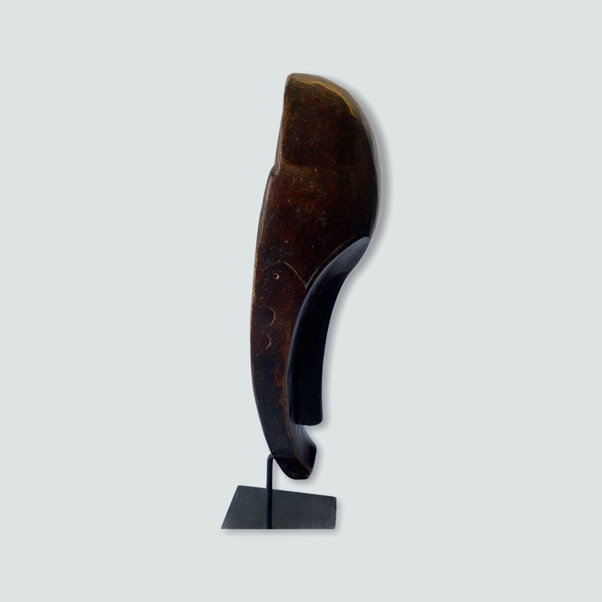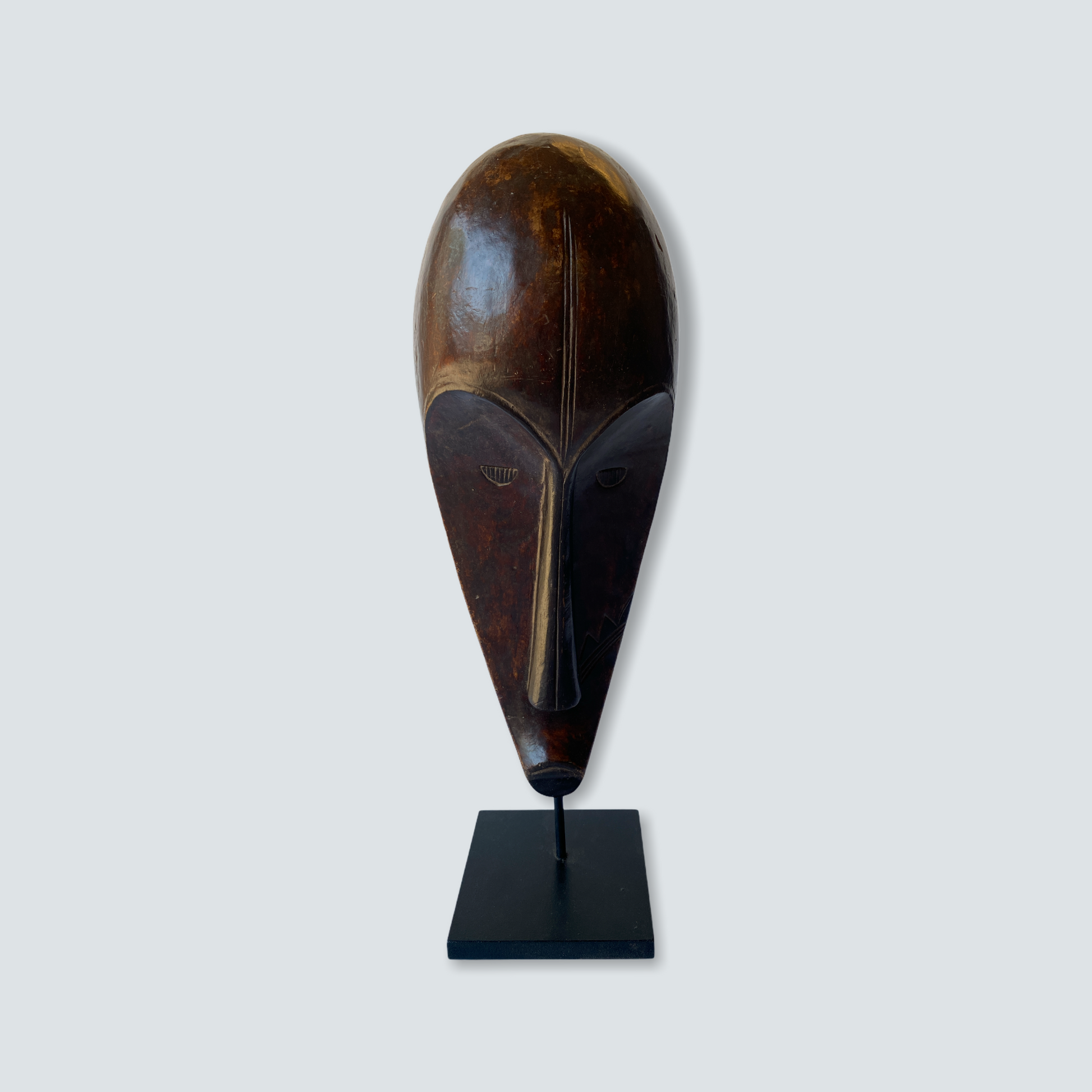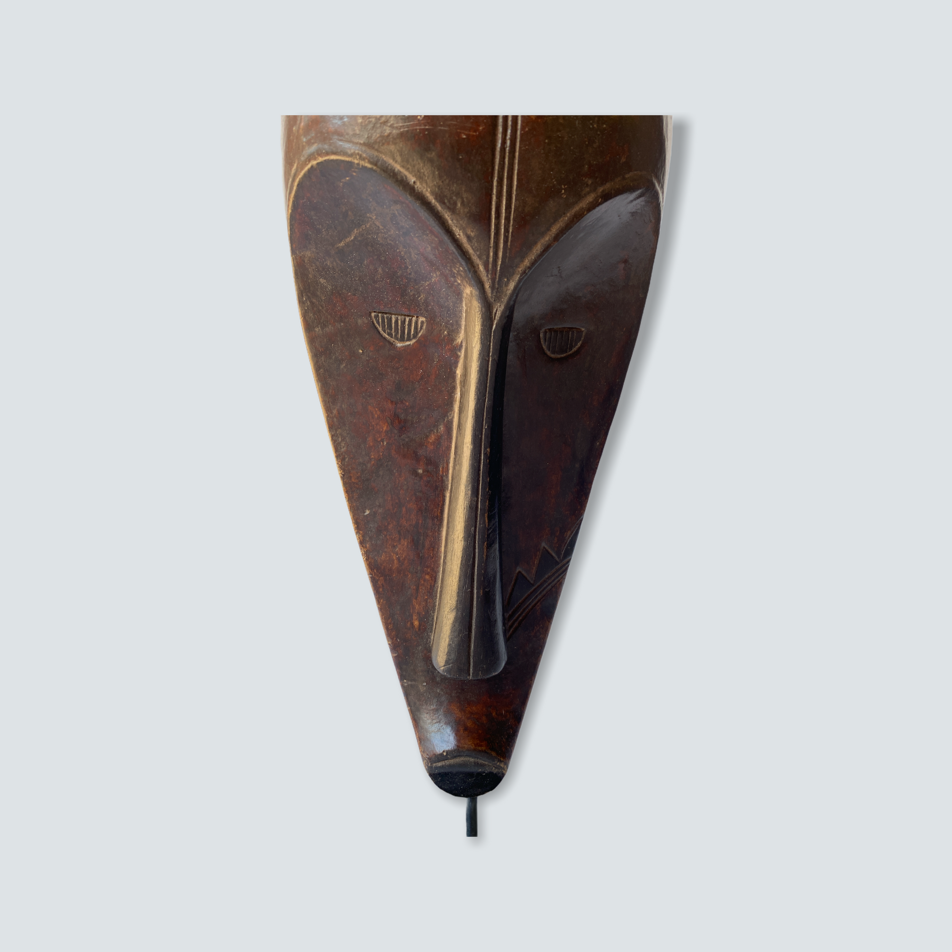 Well known for their reliquary figures the Fang also danced finely sculpted masks during a number of ritual activities. Among the Fang, white-painted masks identified with the Ngil society are known for their elegant abstractions of the human face. Ngil masks have been described as having a 'heart-shaped face' due to the facial features emphasizing refined curves of the orbital ridges above the eyes and the prominent line of the long tapering nose that ended above a discretely mouth carved at the bottom of the chin that completes the abstraction of the face. The Fang people used masks in their secret societies. Members of this male society wore the Ngil masks during the initiation of new members and the persecution of wrongdoers. Masqueraders, clad in raffia costumes and attended by helpers, would materialize in the village after dark, illuminated by flickering torchlight.
