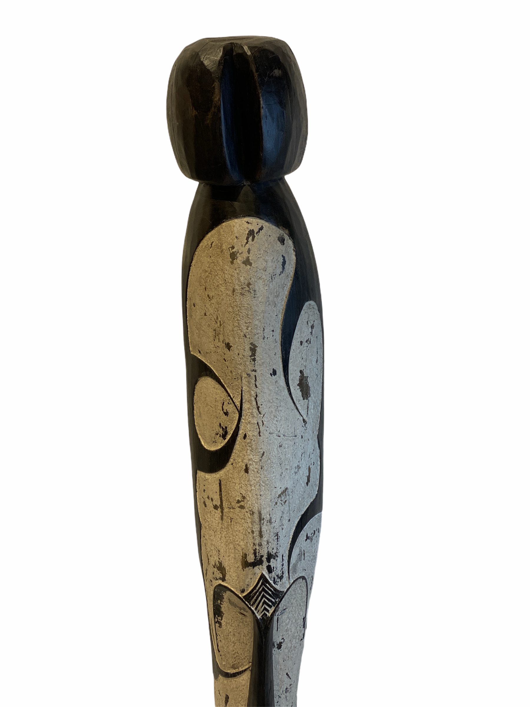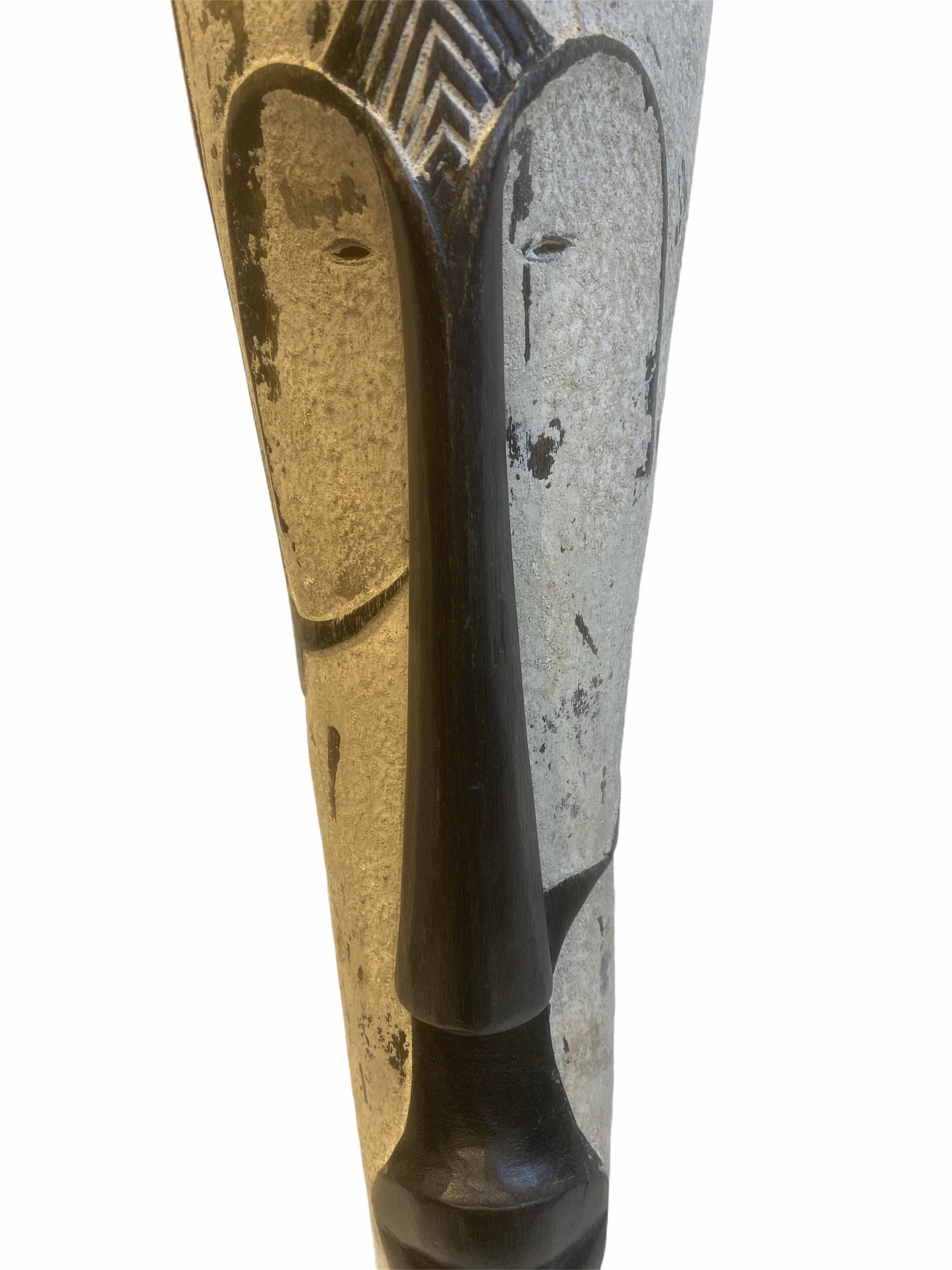 Well known for their reliquary figures the Fang also danced finely sculpted masks during a number of ritual activities. Among the Fang, white-painted masks identified with the Ngil society are known for their elegant abstractions of the human face. Ngil masks have been described as having a 'heart-shaped face' due to the facial features emphasizing refined curves of the orbital ridges above the eyes and the prominent line of the long tapering nose that ended above a discretely mouth carved at the bottom of the chin that completes the abstraction of the face. The Fang people used masks in their secret societies. Members of this male society wore the Ngil masks during the initiation of new members and the persecution of wrongdoers. Masqueraders, clad in raffia costumes and attended by helpers, would materialize in the village after dark, illuminated by flickering torchlight.