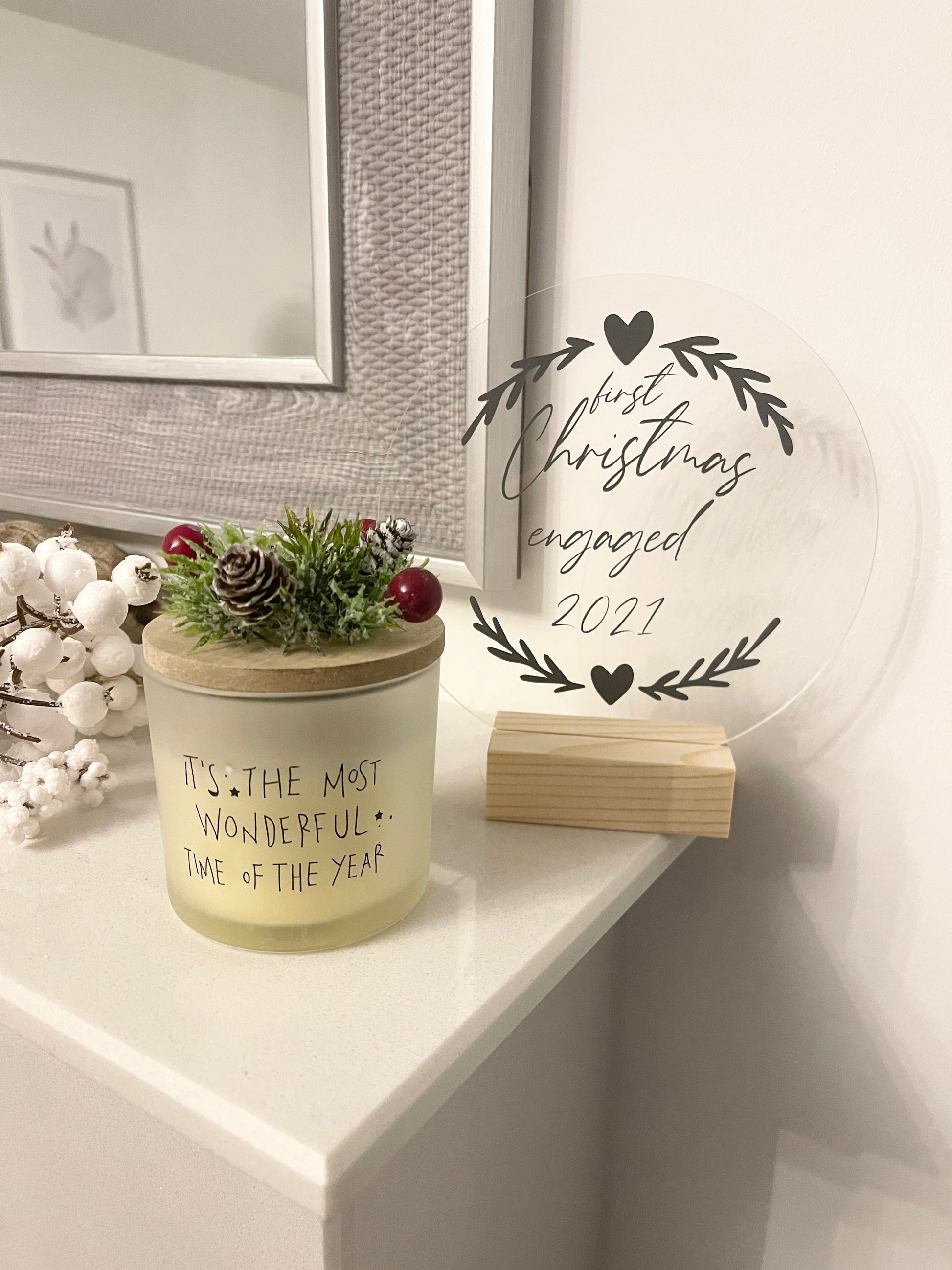 First Christmas Engaged Heart Wreath Christmas Acrylic Plaque Sign With Wooden Base