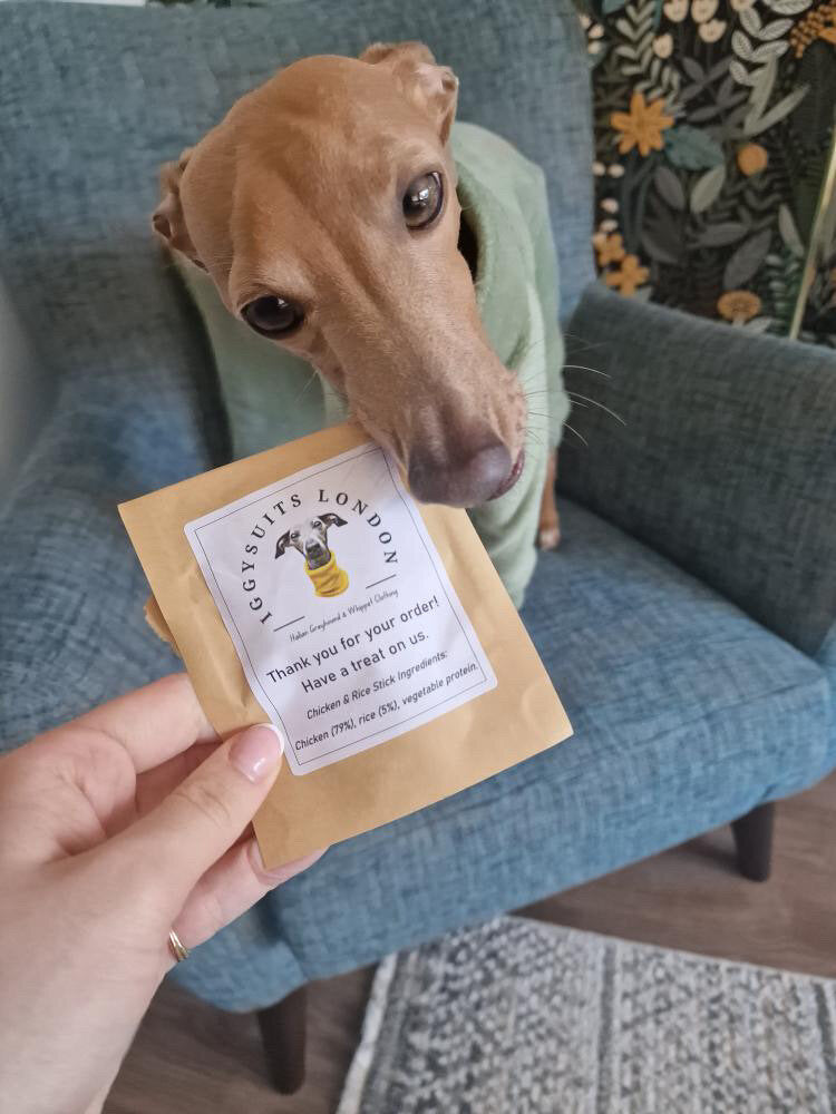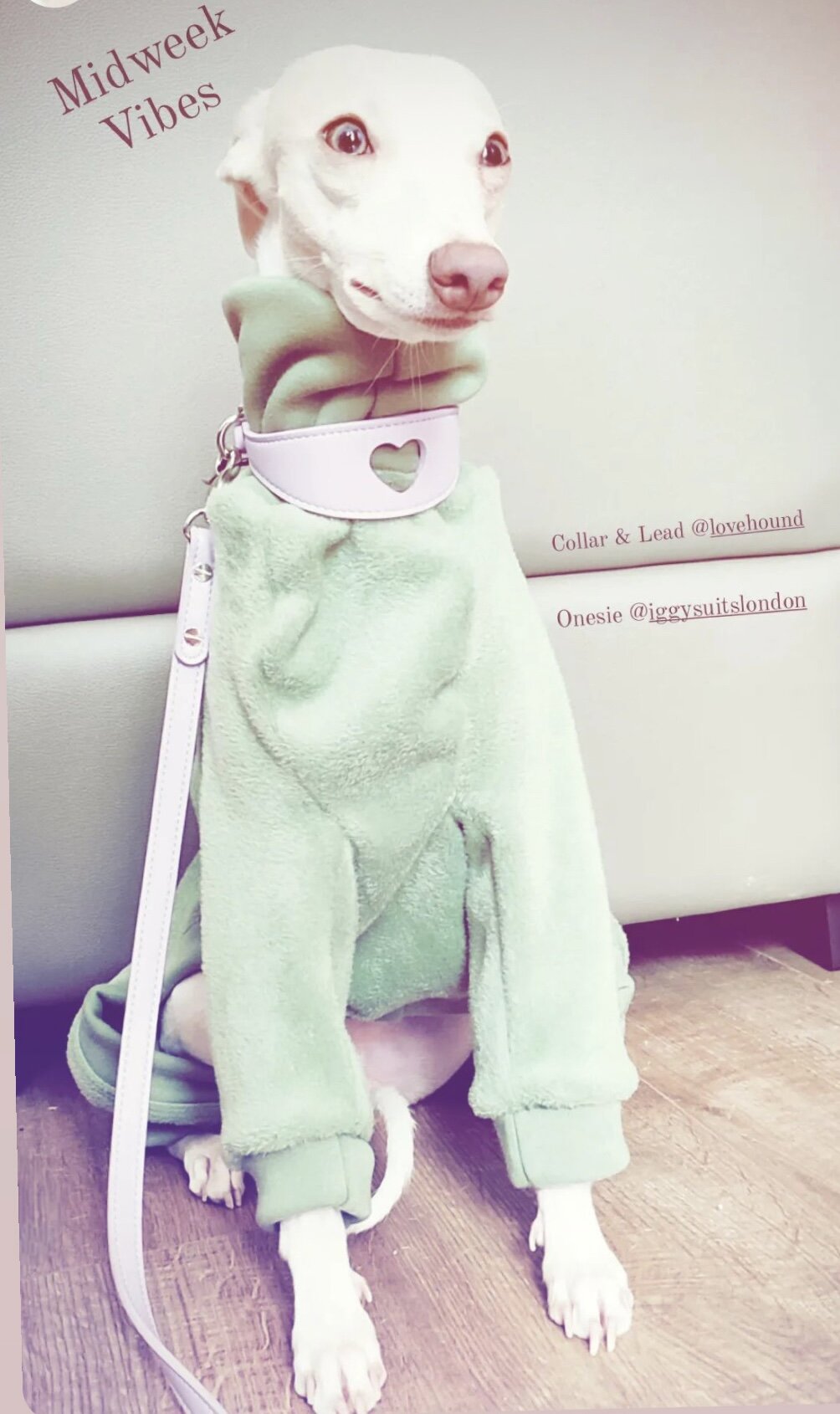 Our IggySuitsLondon fleece lined sweatshirt suit in Sage Green with 4 legs.