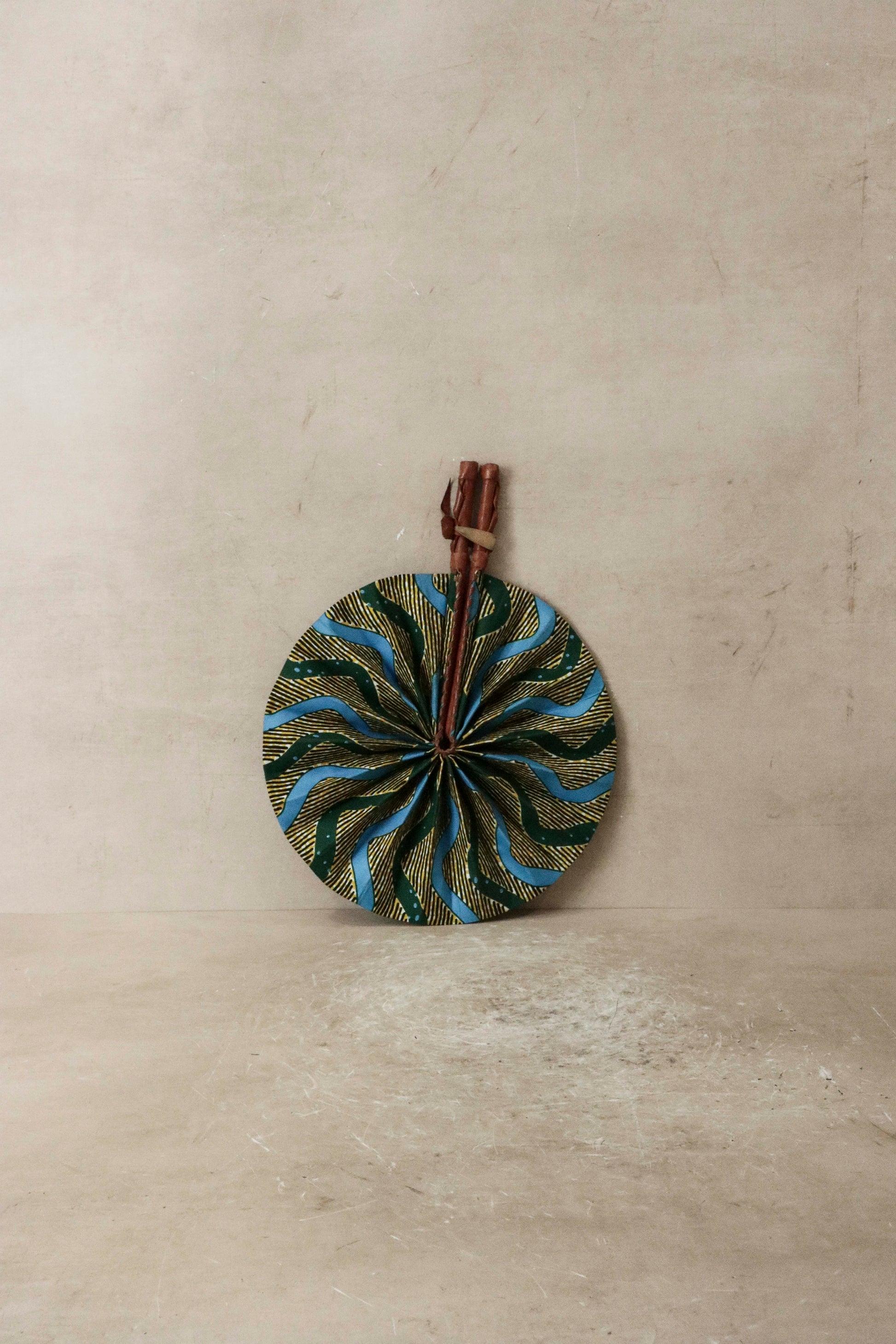 Handmade in Ghana these fans are made from traditional african fabric which has been stiffened and pleated and then made into a fan and fastened with a butter soft leather thong.