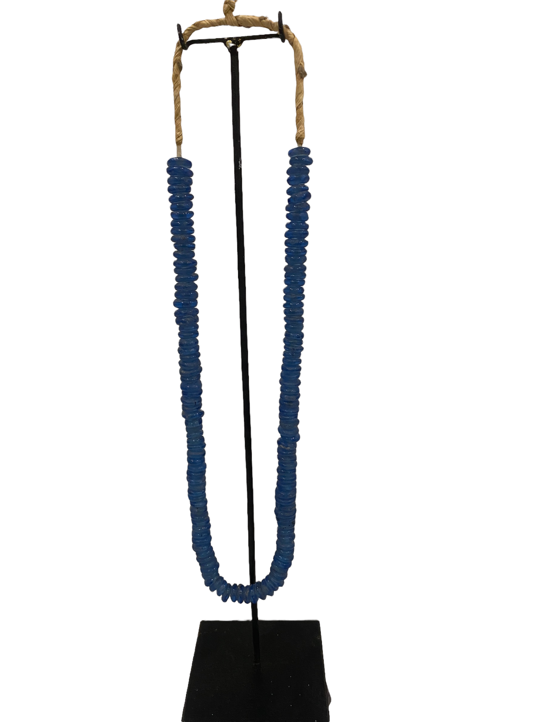 African recycled glass beads are made by members of the Krobo people which is located in Ghana. These beads are created by compressing glass into a dry grain, and heating the grain so that the pieces form together. The recycled glass is rushed into a porcelain cast. The stem of a cassava leaf is used to make the hole. It is baked in a furnace causing the glass to melt together and cassava stem to burn. This technique has been used in Africa for centuries to make recycled glass beads.