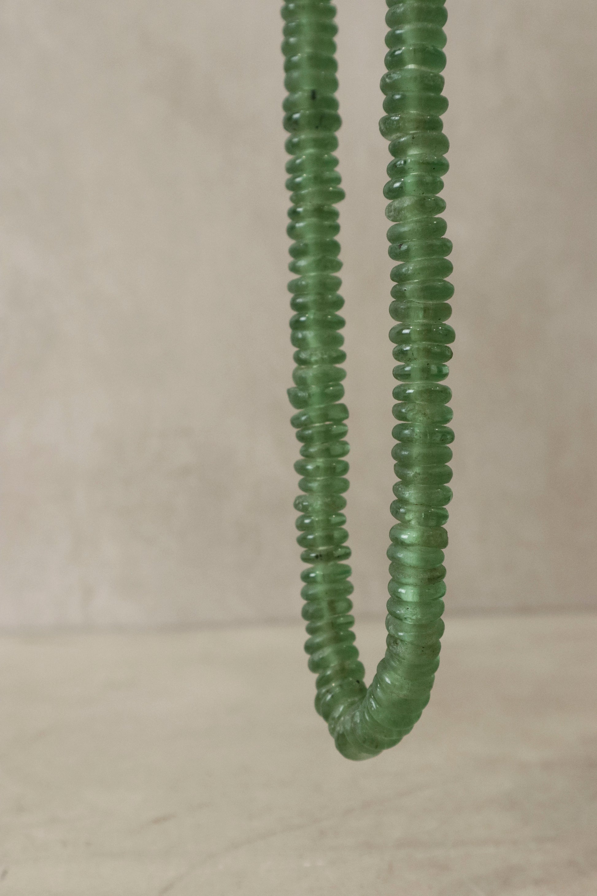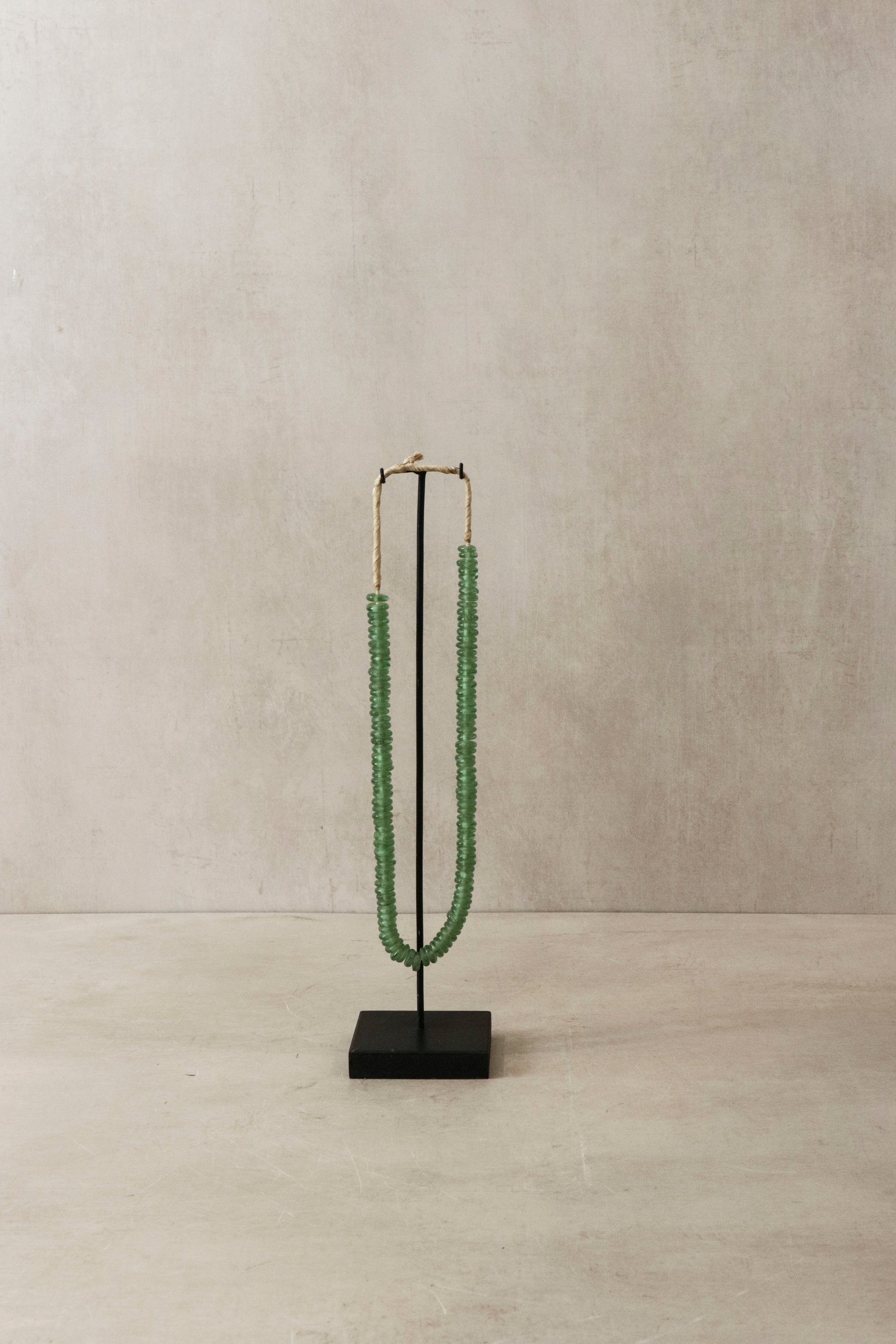 African recycled glass beads are made by members of the Krobo people which is located in Ghana. These beads are created by compressing glass into a dry grain, and heating the grain so that the pieces form together. The recycled glass is rushed into a porcelain cast. The stem of a cassava leaf is used to make the hole. It is baked in a furnace causing the glass to melt together and cassava stem to burn. This technique has been used in Africa for centuries to make recycled glass beads.
