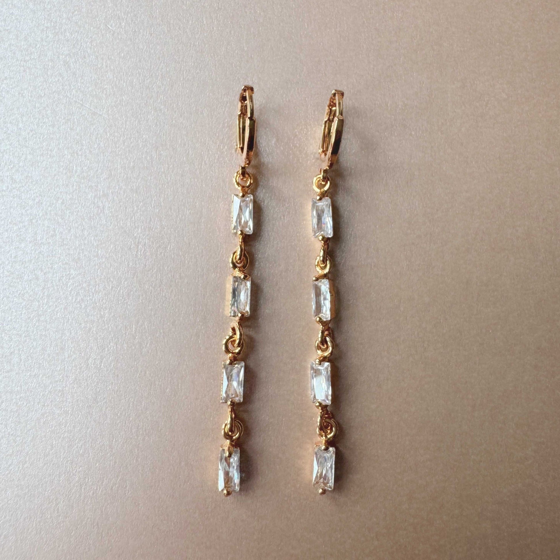 Elevate your style with these Gold Crystal Drop Earrings, featuring a sleek linear design of sparkling baguette-cut crystals. The delicate chain-like structure gives these earrings a lightweight, elegant feel, while the gold accents add a touch of luxury. Perfect for both everyday wear and special occasions, these versatile earrings effortlessly pair with any outfit. Whether you're looking to add a subtle shimmer to your daytime look or a refined touch the evening, these earrings are a must-have!