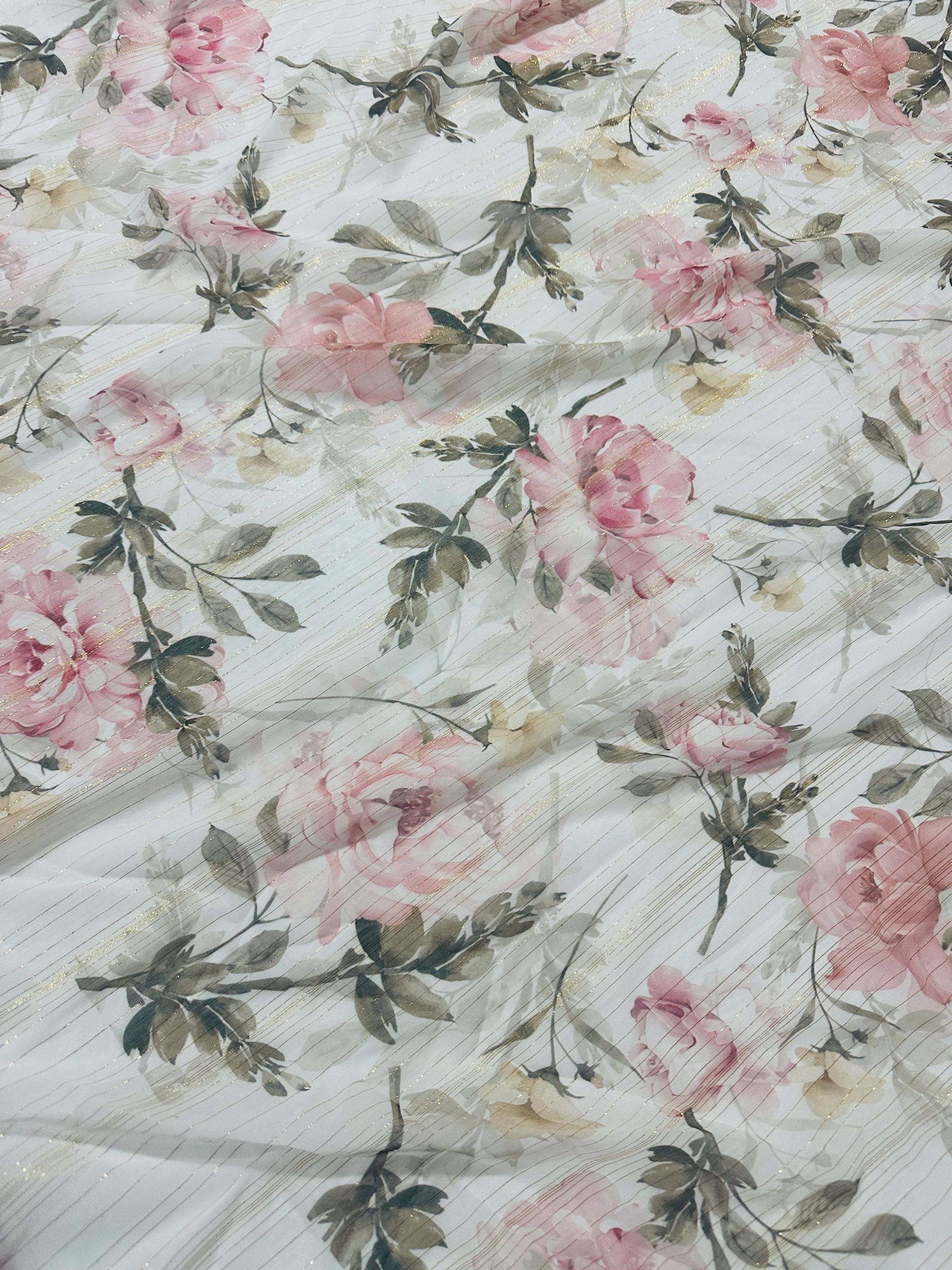 Introducing our Glitter Chiffon Fabric with a stunning gold striped floral print. This lightweight and elegant fabric is perfect for a variety of sewing projects, adding a touch of sparkle and sophistication. Its beautiful floral design and shimmering stripes make it an ideal choice for dresses, skirts, and accessories. Enjoy the versatility and charm of this exquisite chiffon fabric in your next creation.