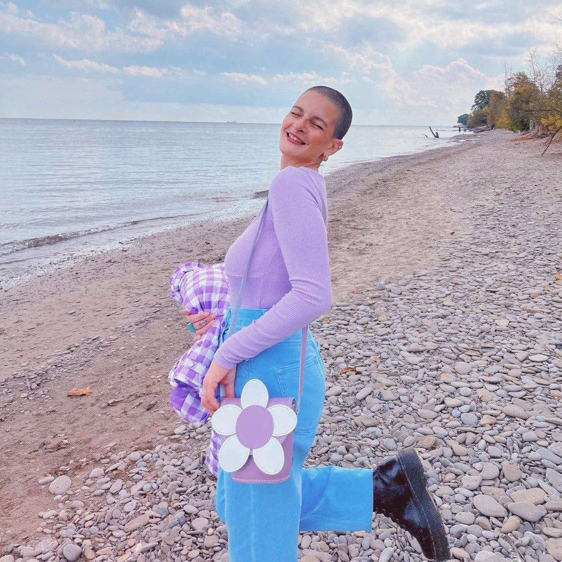 Our pretty floral daisy bag is made up of two contrasting colours making a unique and stylish composition. A pastel Violet body, white petals and a pretty pastel violet centre.