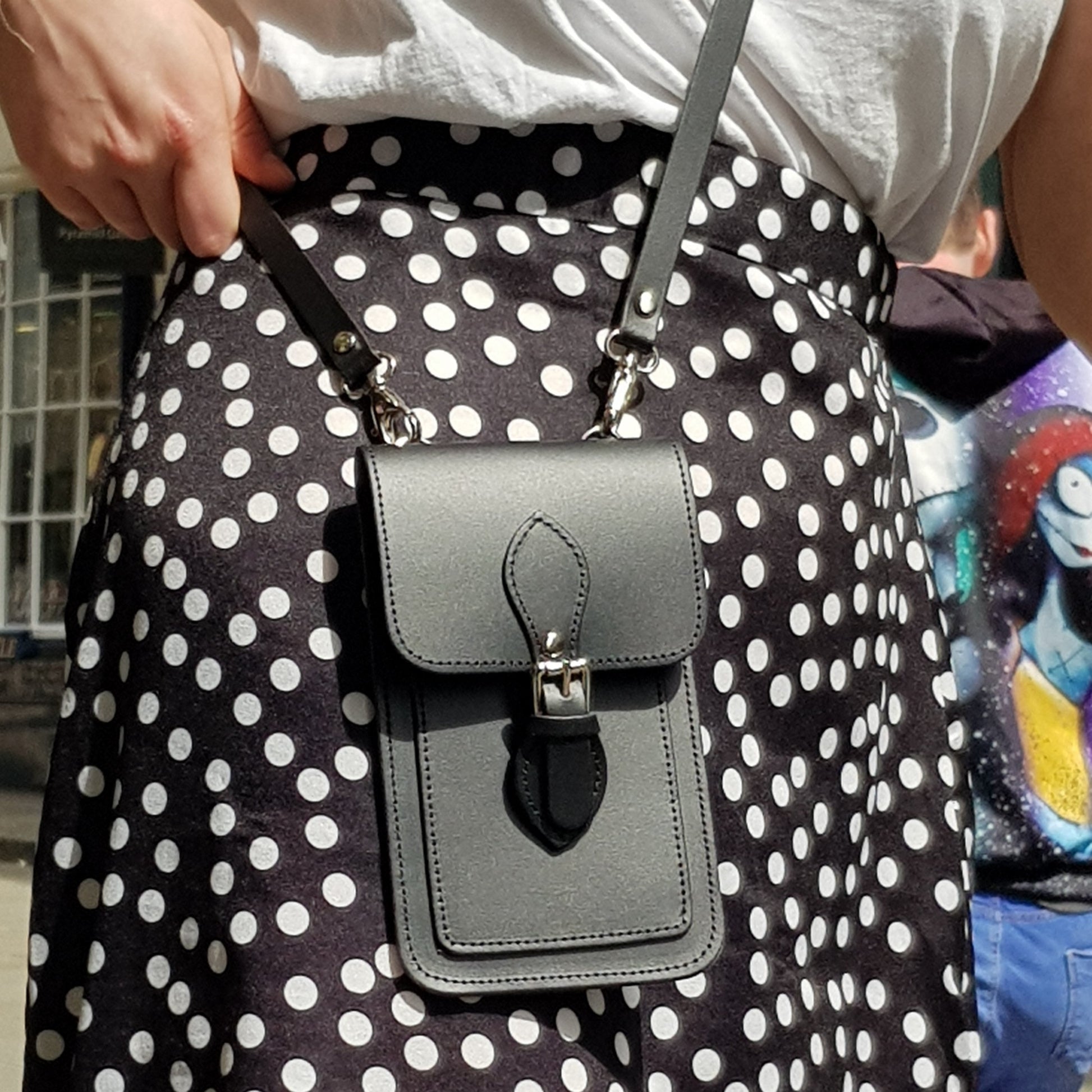 Carry your phone and accessories, like cards and cash, in style with pockets on the rear and inside. The main compartment is closed behind a convenient magnetic fastener and the crossbody strap is adjustable and can be removed if needed.