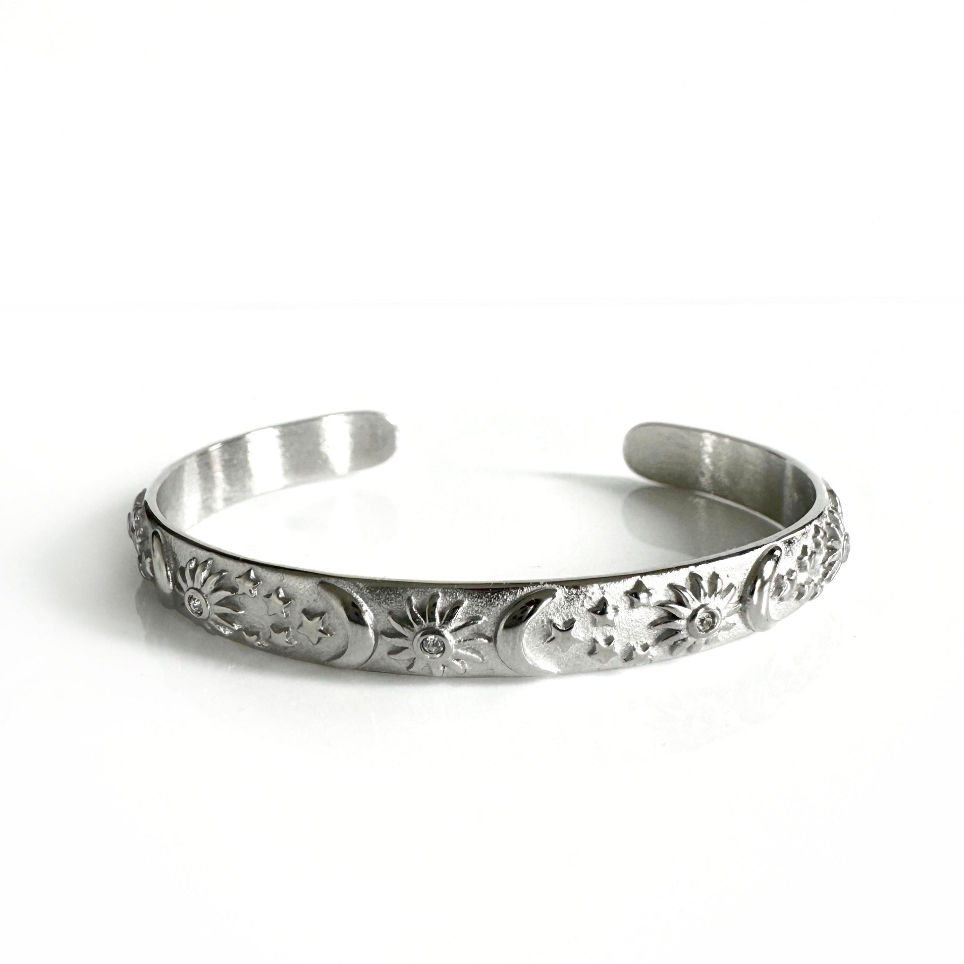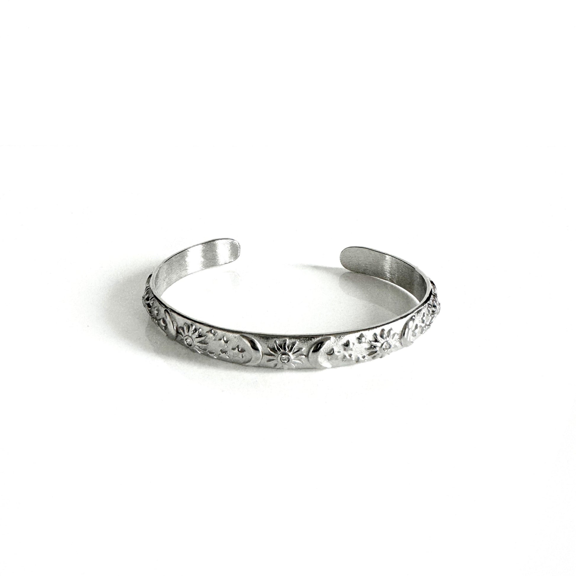 The premium gold Helia Luxe bangle, features a sun, moon and stars design with just the right touch of sparkle for a luxury finish. The perfect accessory to elevate your every day look, the Helia bangle will become your new style staple
