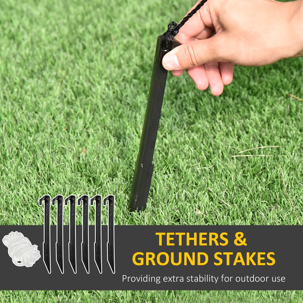 - Six ground stakes, two guy ropes and an internal fan for stability
