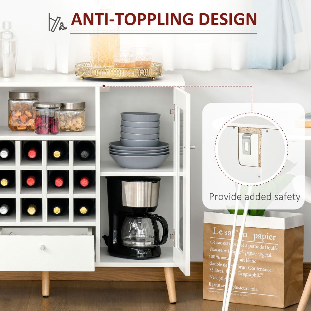HOMCOM Modern Sideboard Storage Cabinet Kitchen Cupboard Dining Bar Server with Glass Doors, Drawer & 12-Bottle Wine Rack for Living Room, White