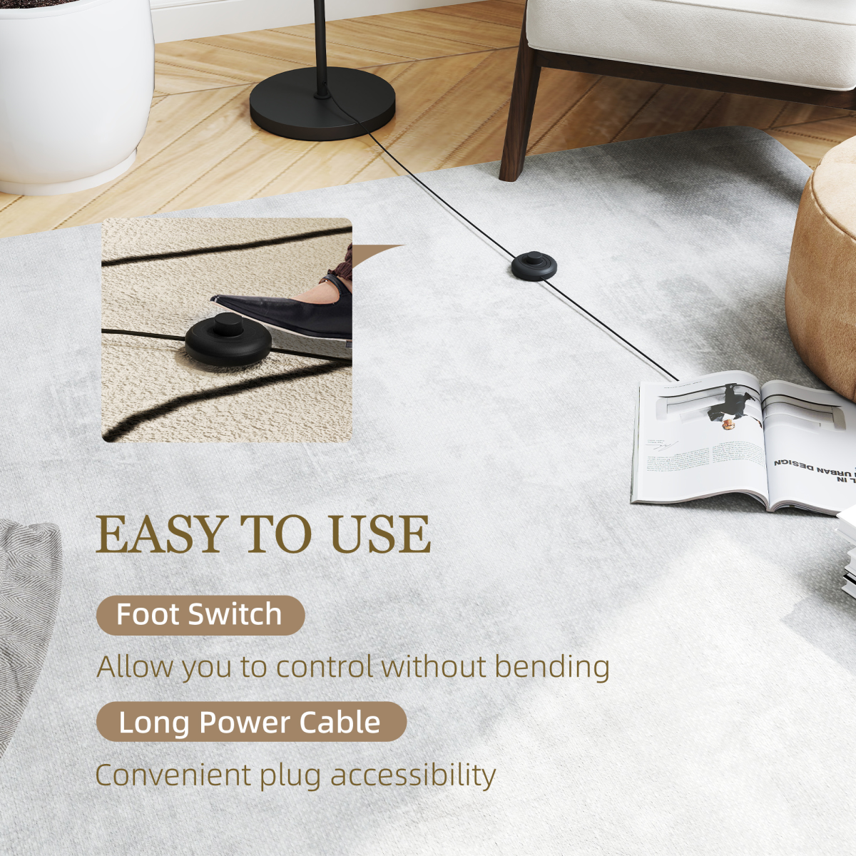 ● Foot switch for turning on/off easily. Handy 1.8m power cable