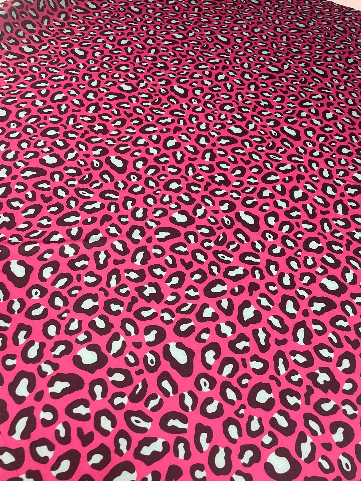 Striking hot pink leopard print fabric with bold animal pattern. Ideal for dresses, tops, and statement fashion pieces. Sold by the metre.