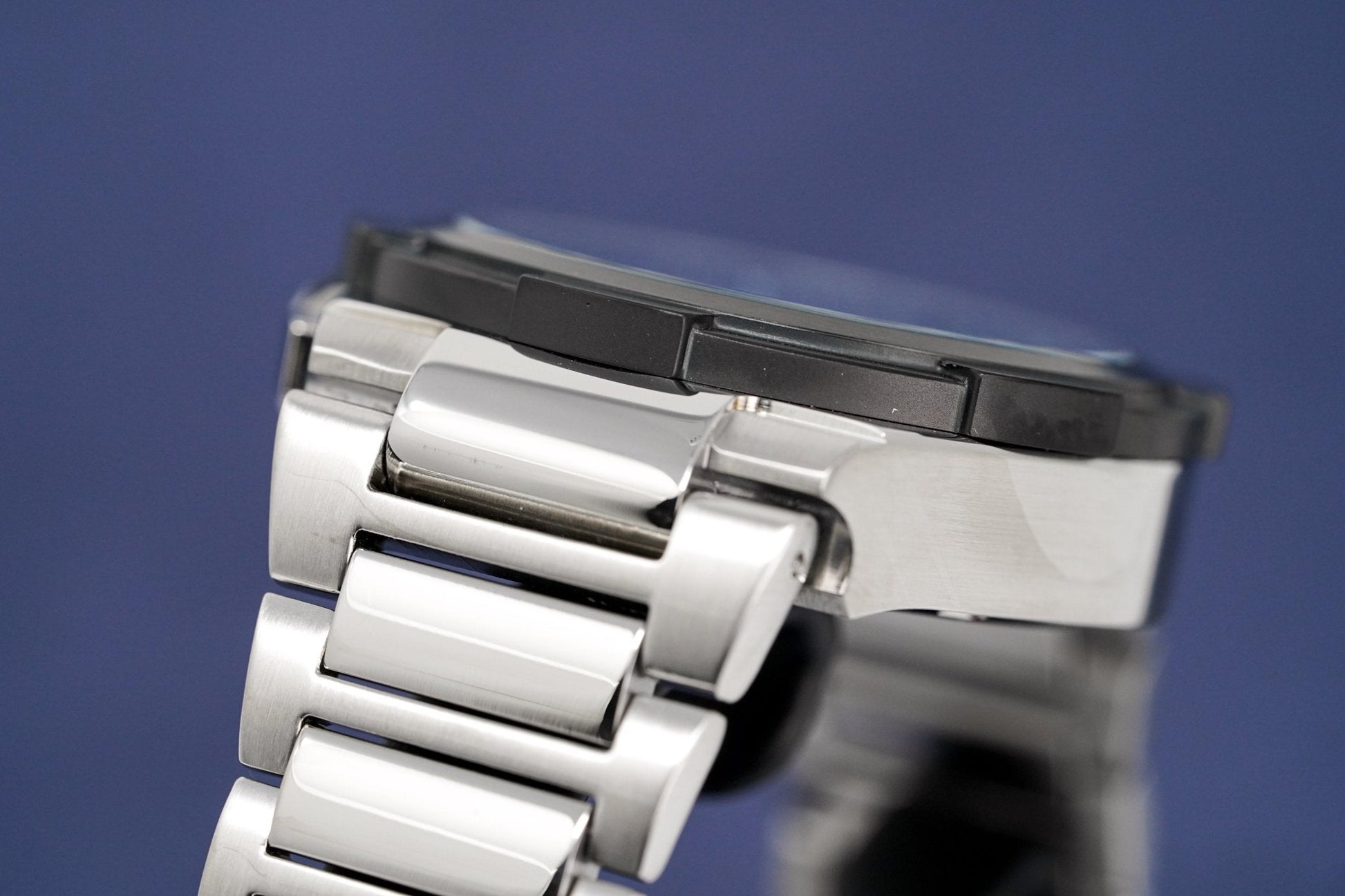 Blue Guillochè Dial. Stainless Steel Hands. Stainless Steel Stick Indexes. Date Window at 4:30.