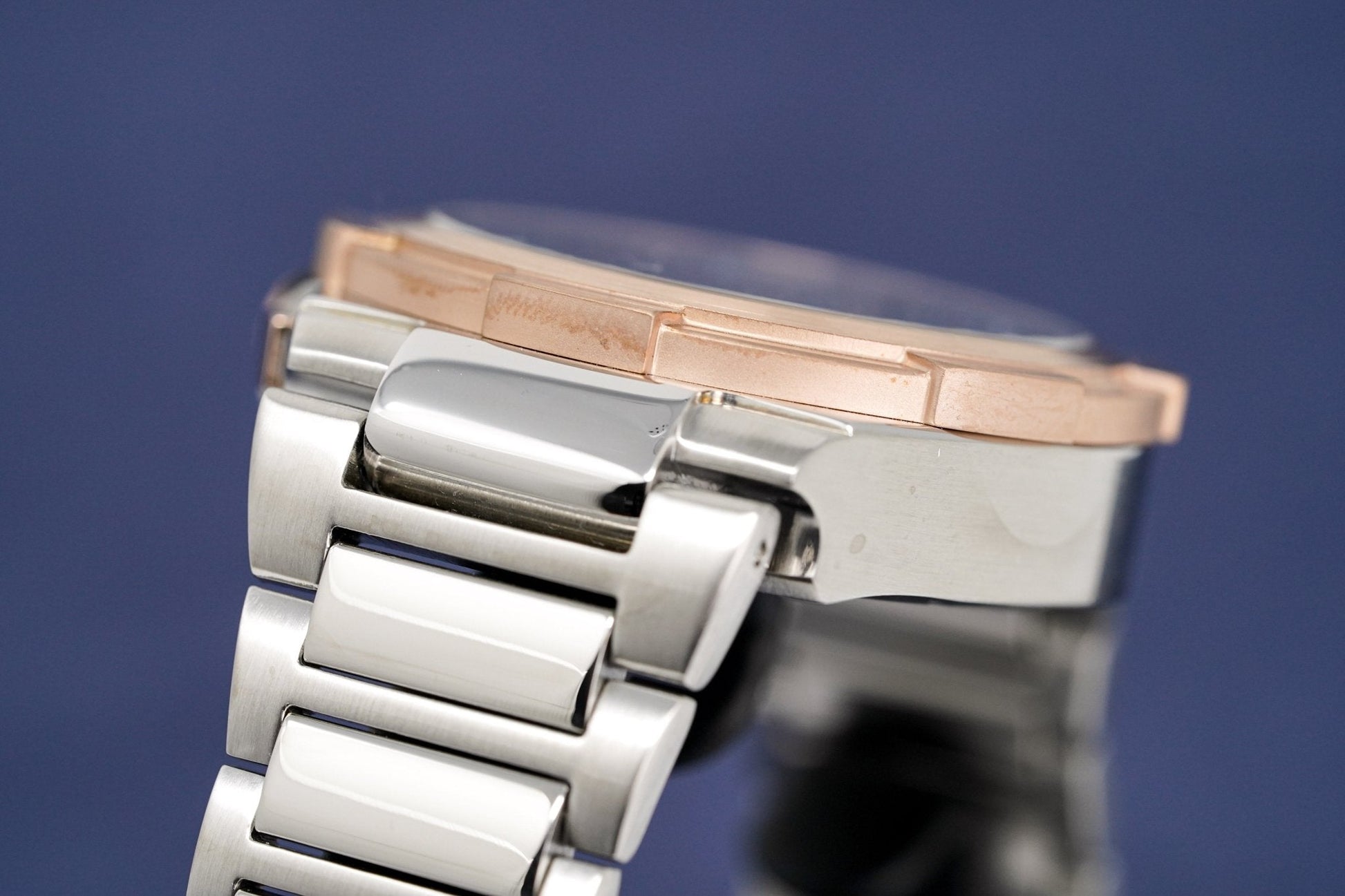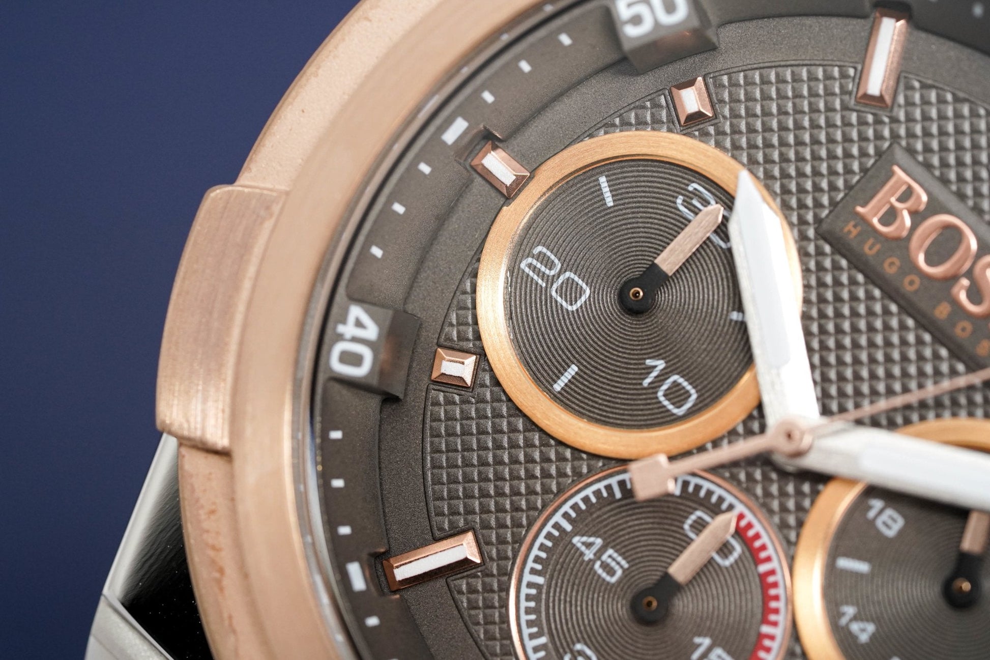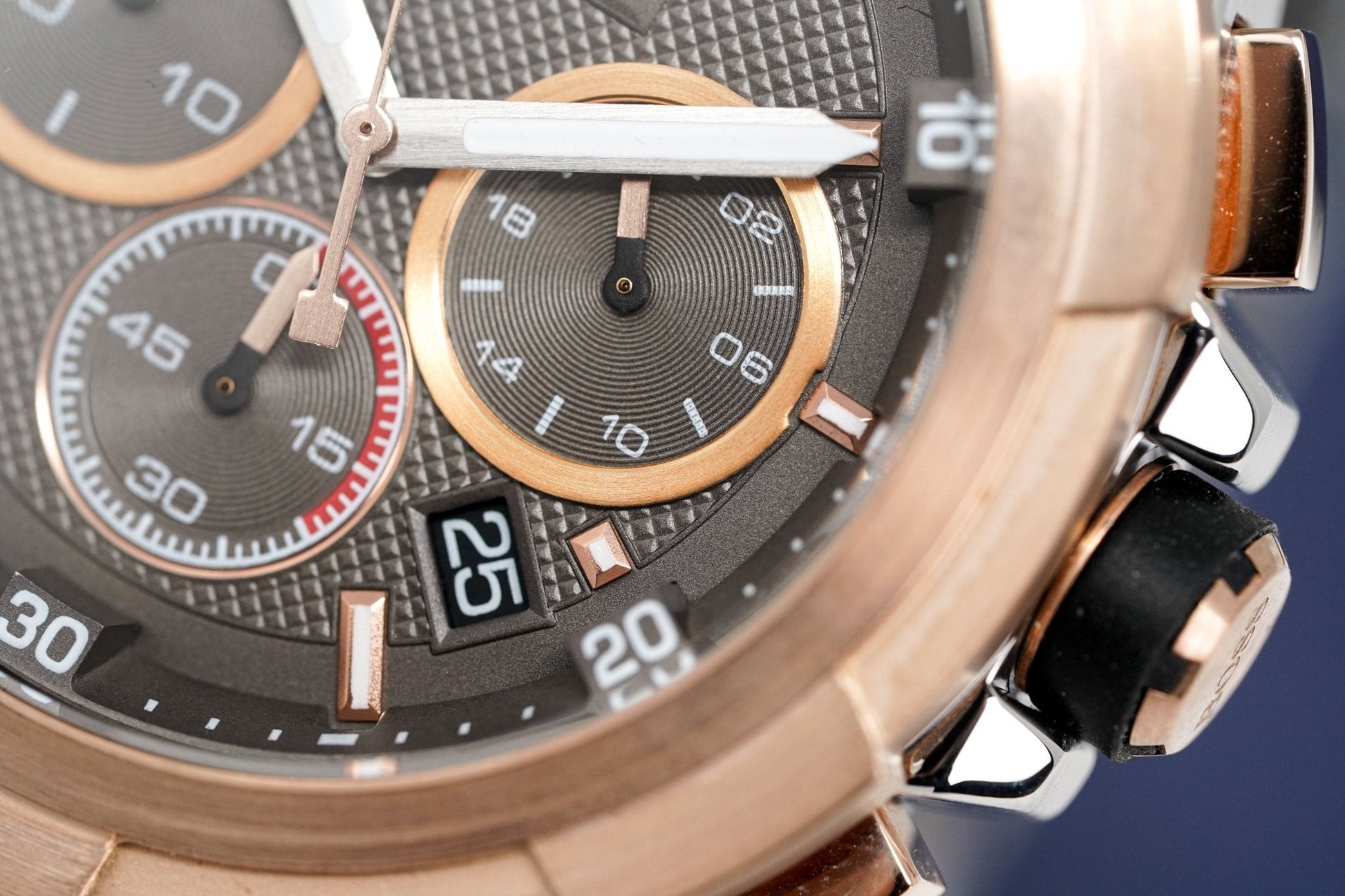 Grey Guillochè Dial. Stainless Steel Hands. Rose Gold PVD Plated Stainless Steel Stick Indexes. Date Window at 4:30.