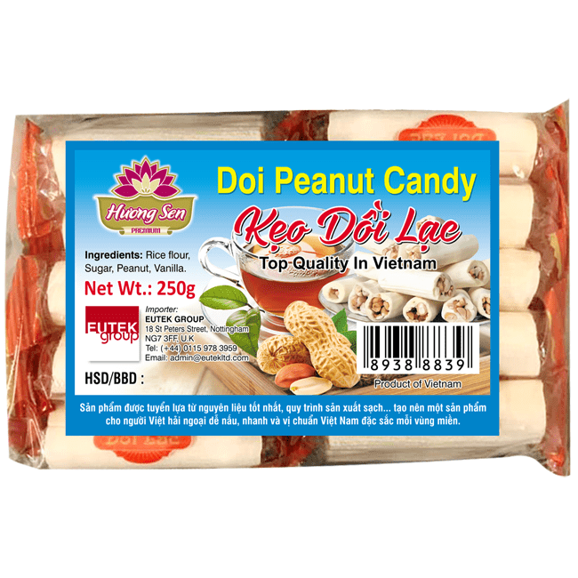 Indulge in the sweet and nutty goodness of HUONG SEN Doi Peanut Candy (Keo Doi Lac)! This 250g pack brings you traditional Vietnamese peanut candy, known for its rich flavor and satisfying crunch. Whether enjoyed as a sweet treat on its own or paired with your favorite desserts, Keo Doi Lac adds a delightful touch to your snacking experience. Elevate your moments of indulgence with the authentic taste and quality of HUONG SEN Doi Peanut Candy!