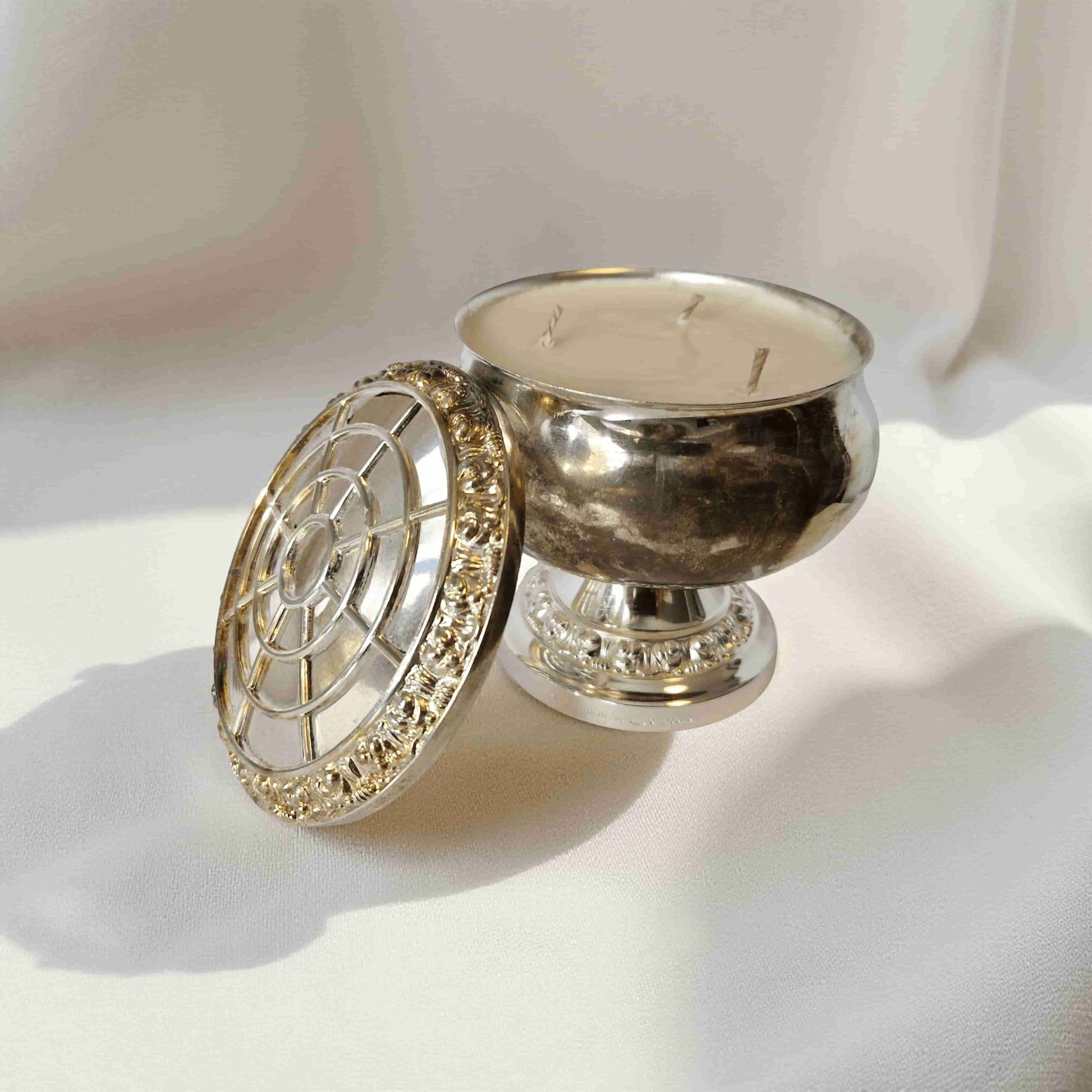 A one-of-a-kind treasure: this candle is hand-poured into a vintage Ianthe Georgian silver-plated rose bowl, originally crafted for displaying fresh blooms. Its ornate openwork design bring character and charm to any setting - an elegant piece for those who appreciate heritage and sustainability.