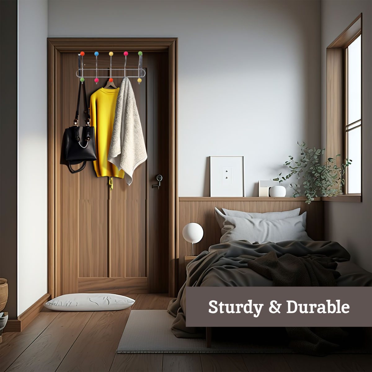 The chrome-coated metal frame provides strength without bulk. Rounded plastic ball ends are gentle on fabrics and easy for children to grasp. The over-door arms are shaped to sit securely yet allow the door to swing smoothly, making it a smart choice for rentals, dorms, and family homes alike.