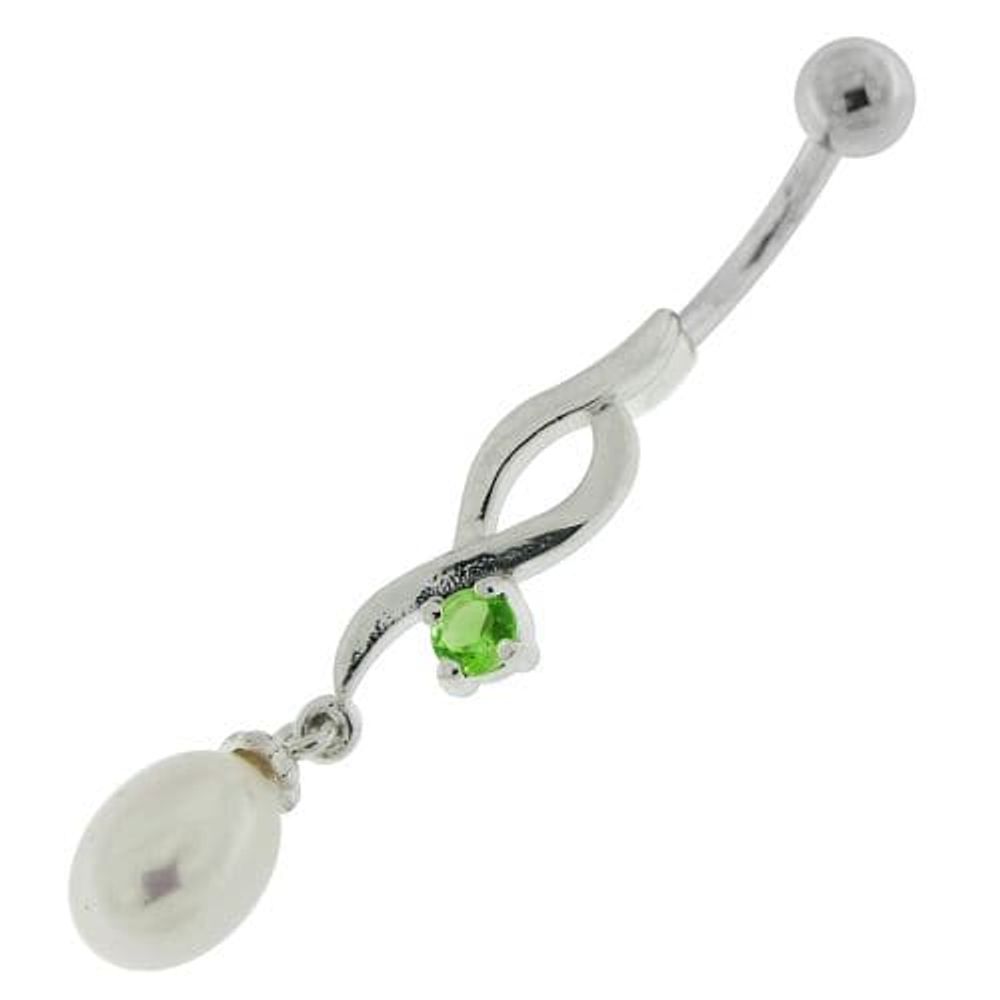 Jeweled And Pearl Silver Fancy Dangling Curved Bar Belly Ring